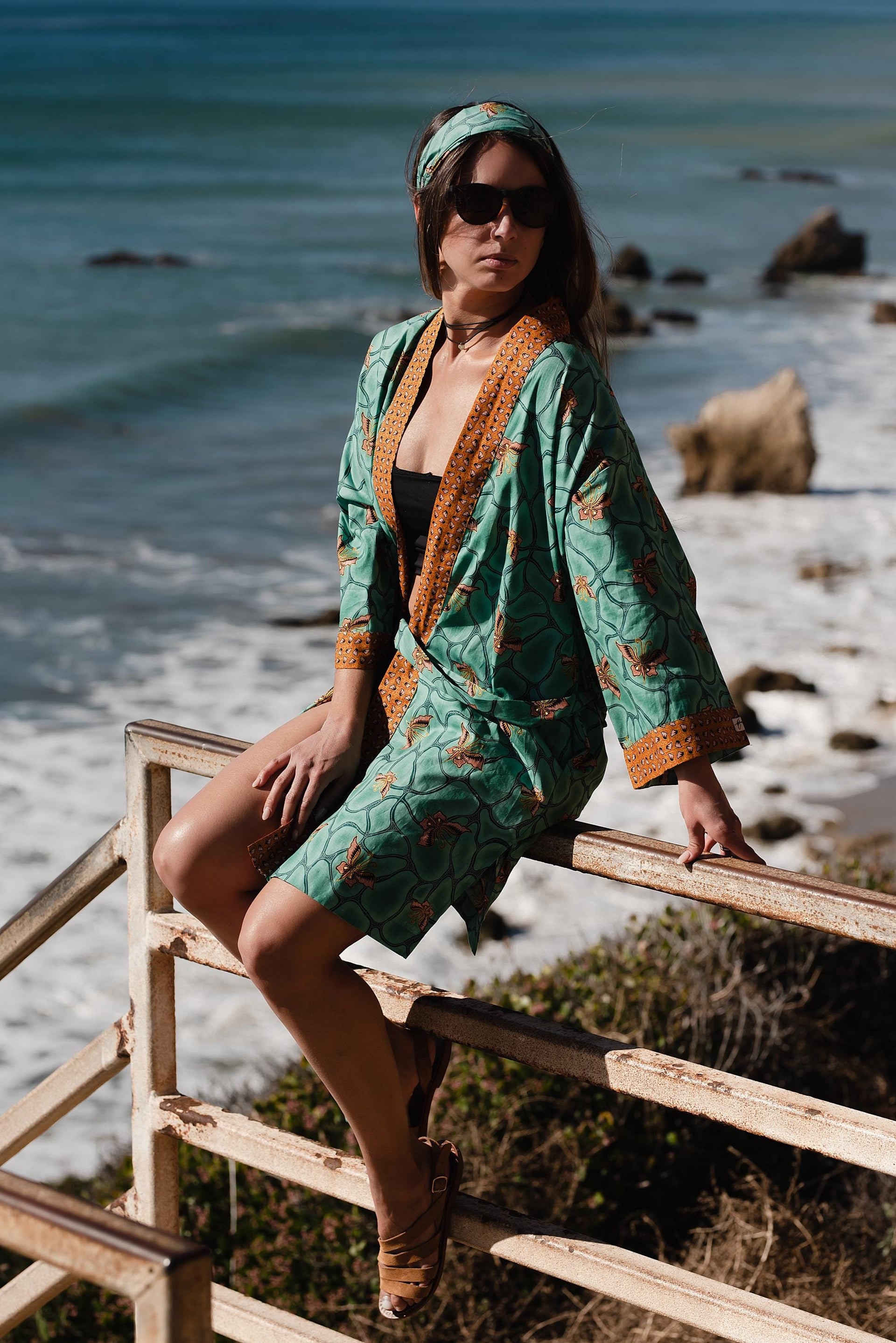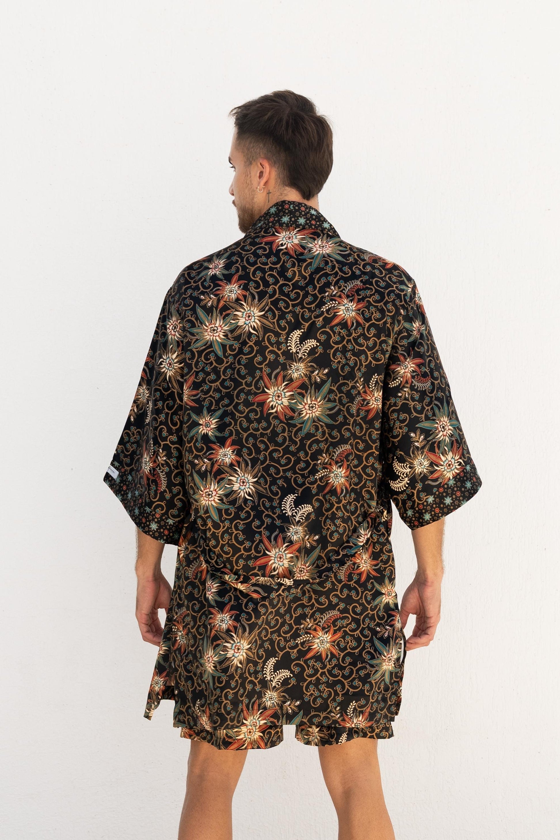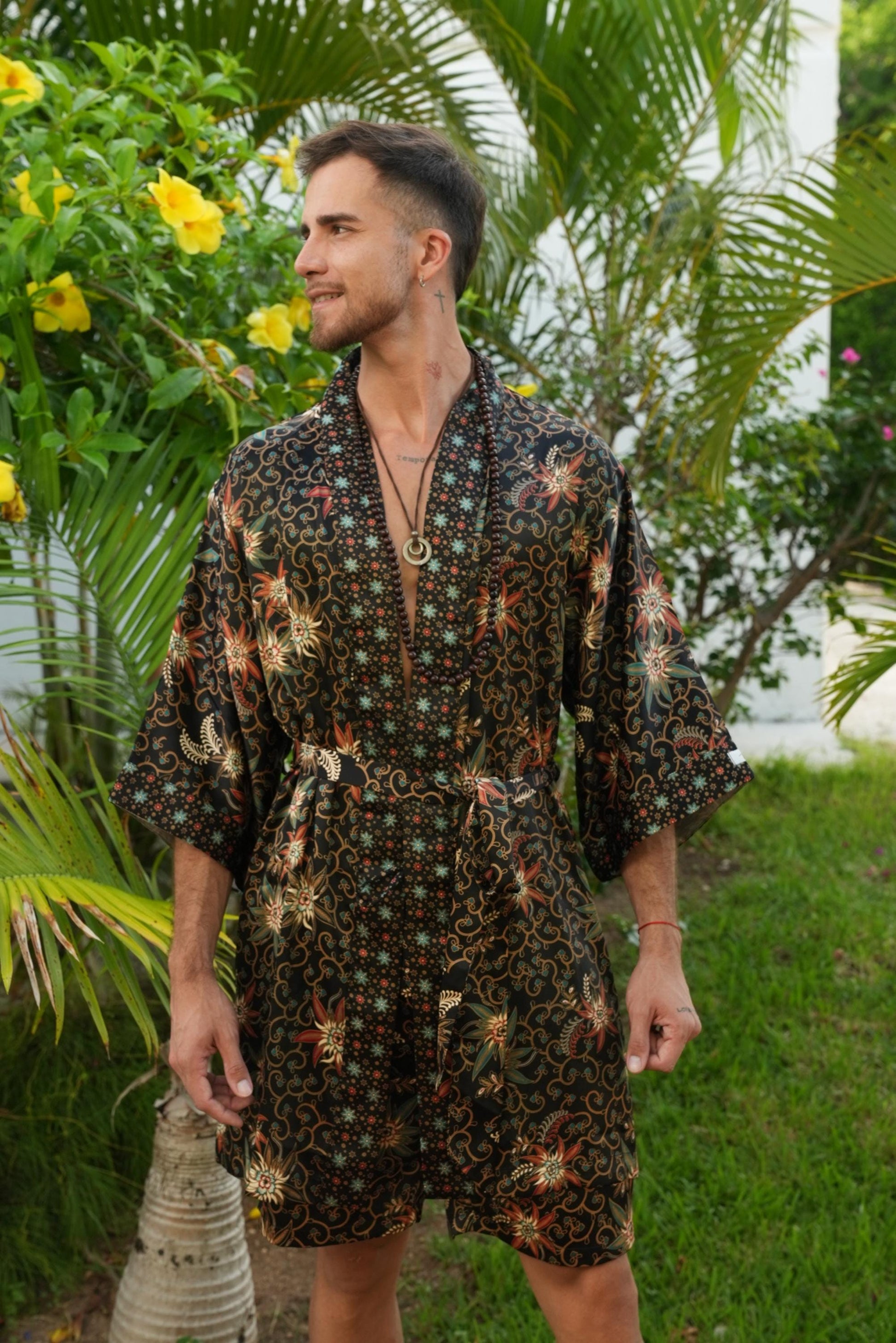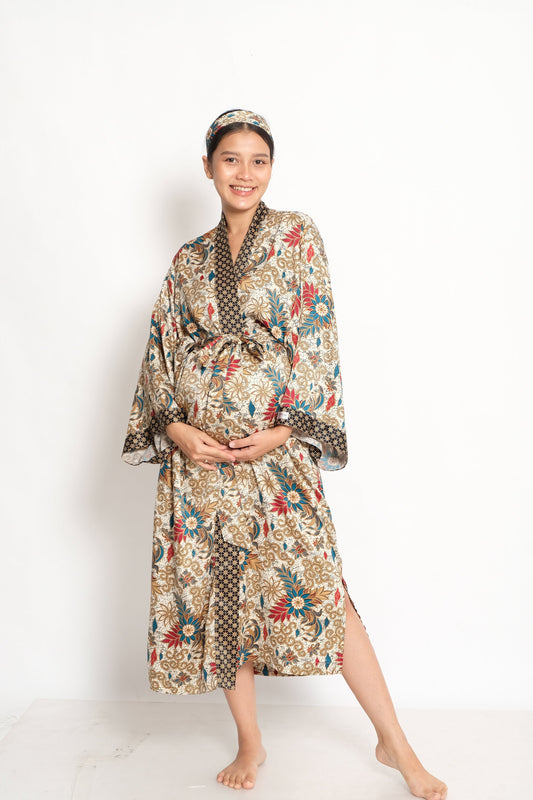 This batik kimono robe is handmade in Bali from a soft silk blend robe fabric that feels smooth against the skin and keeps you cool all summer long. Inspired by Japanese kimono silhouettes, it features wide sleeves, a relaxed fit, and a matchin... read more