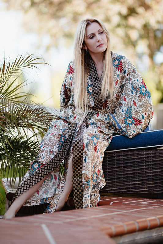 Handmade Silk Blend Kimono Robe: Bali Batik Kaftan