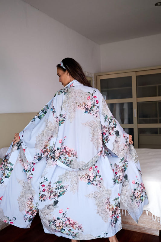 Silk Kimono Robe: Light Blue Floral Boho Loungewear