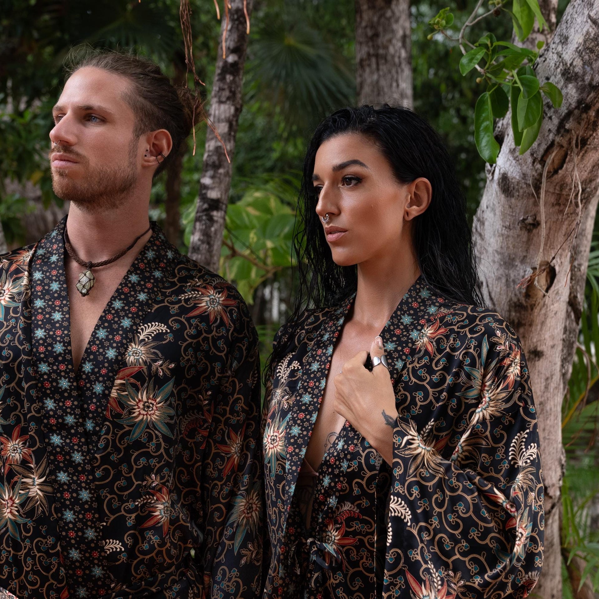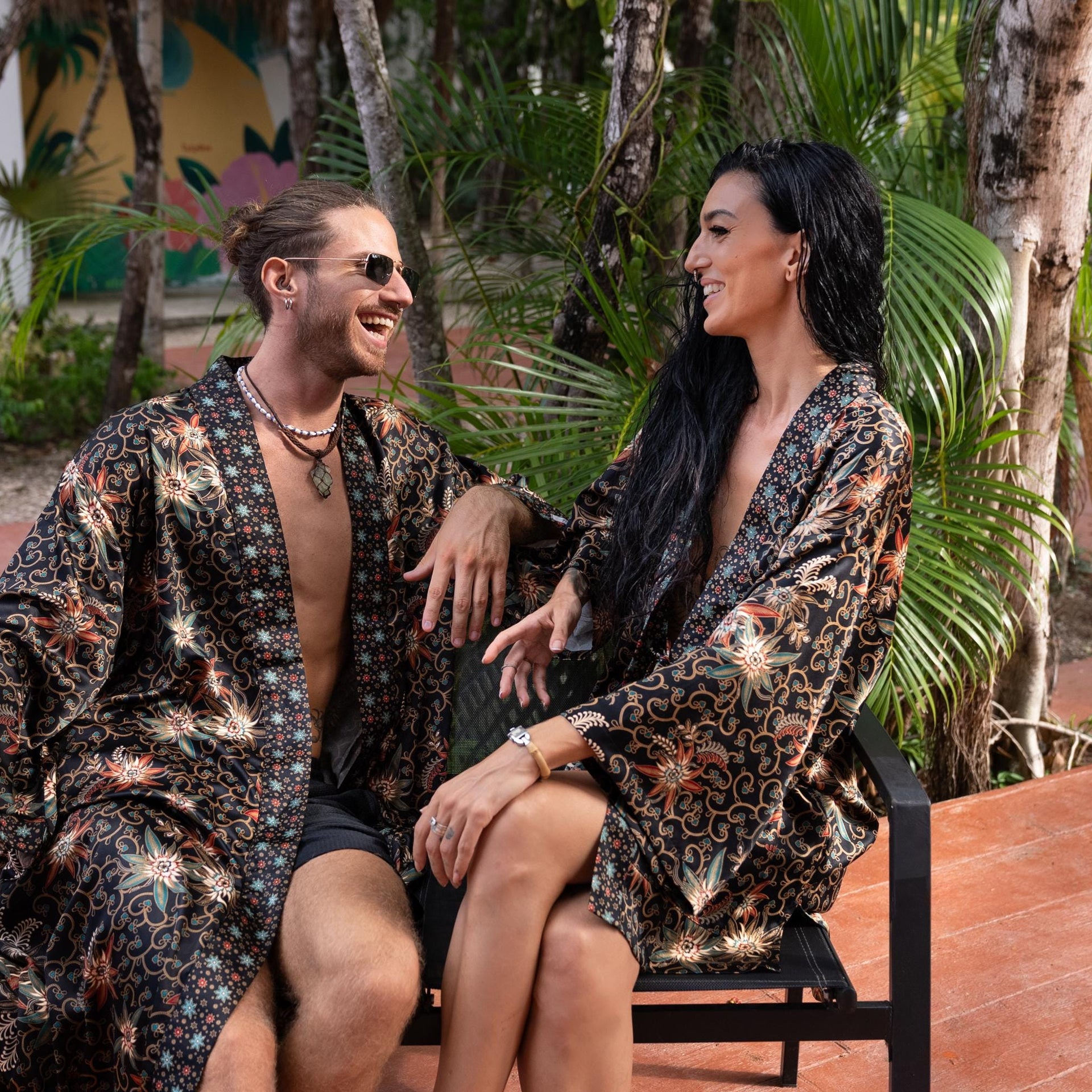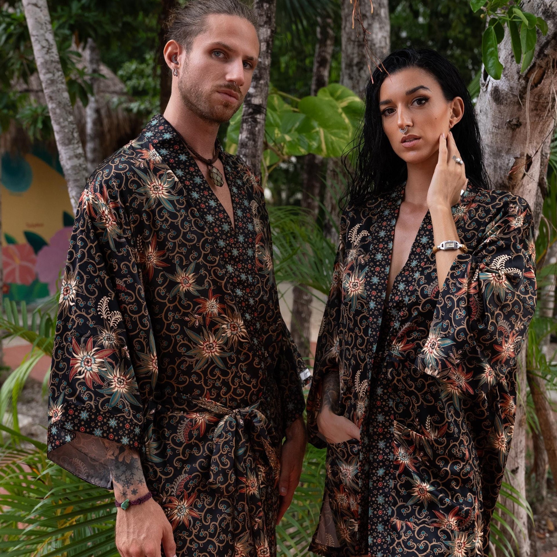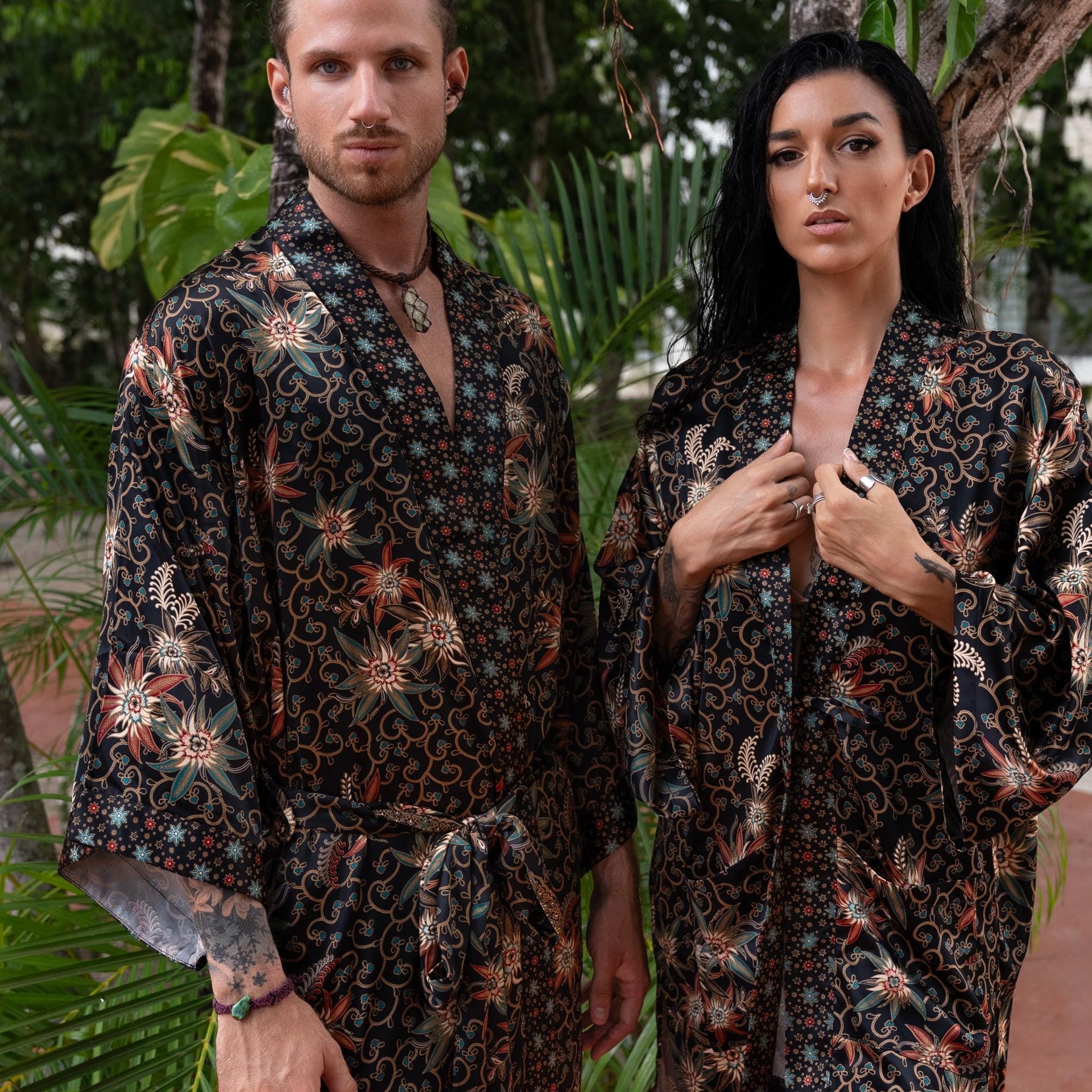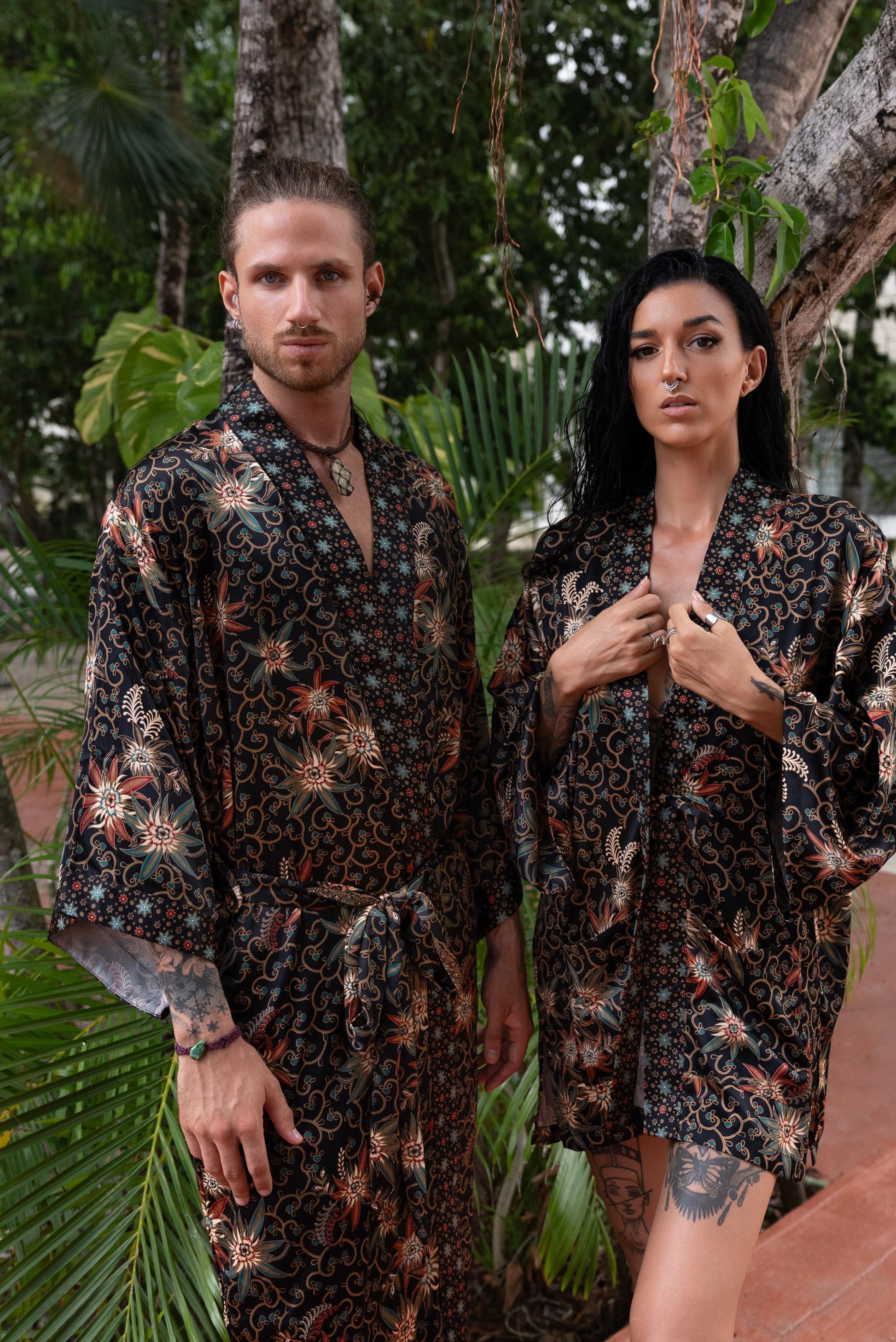 Each silk blend kimono robe features a vibrant hand-printed Bali Batik design that combines boho style with timeless sophistication. The red kimono robes come with matching headbands and are ideal as a gift for him and her. Perfect for resort vacations, weddings, or cozy evenings, these his and hers kimonos wrap you both in luxurious softness and style.