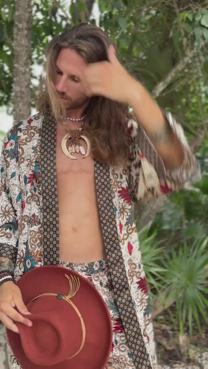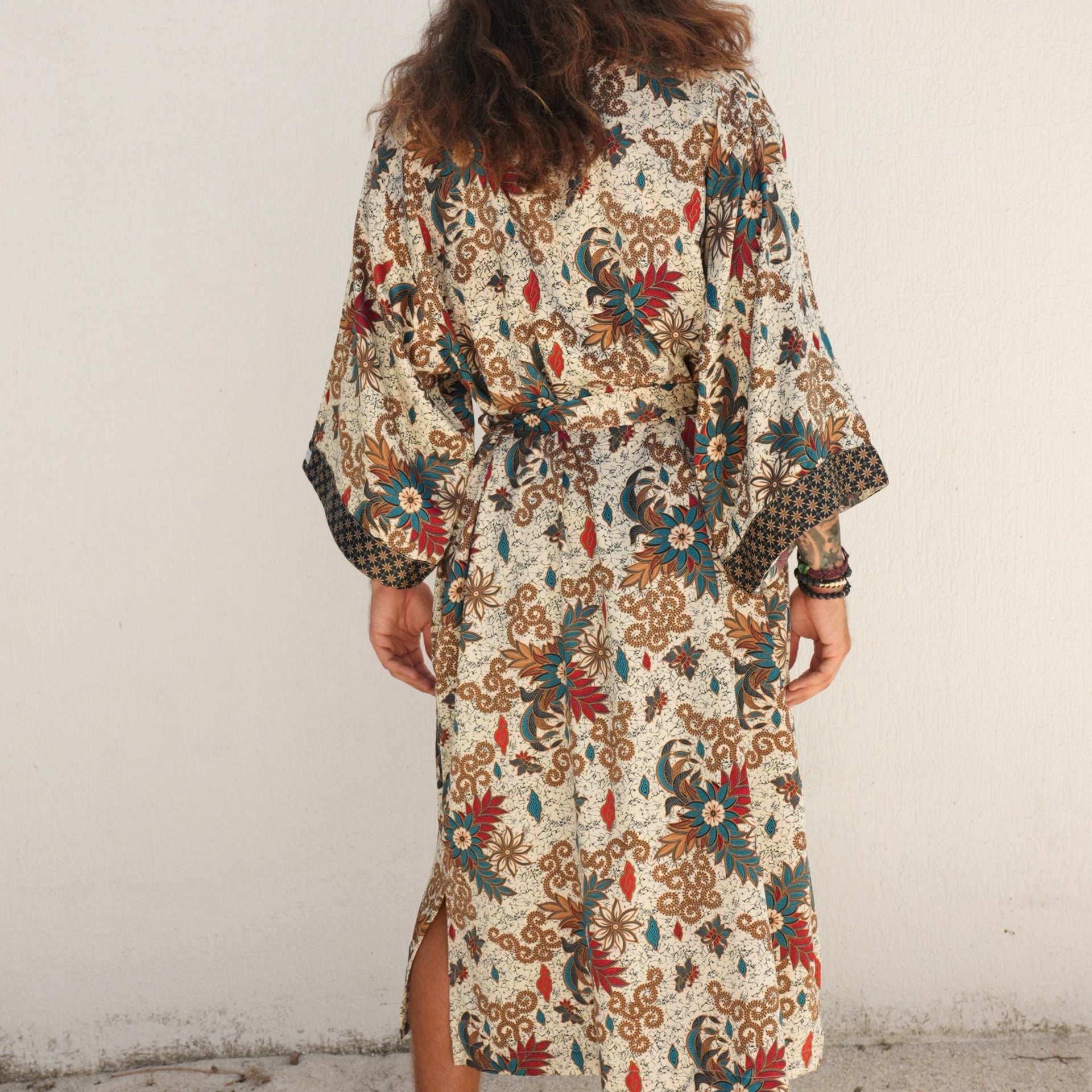 This batik kimono robe is handmade in Bali from a soft silk blend robe fabric that feels smooth against the skin and keeps you cool all summer long. Inspired by Japanese kimono silhouettes, it features wide sleeves, a relaxed fit, and a matching belt to create your perfect look — whether you’re lounging at home, enjoying a spa retreat, or celebrating a special occasion.