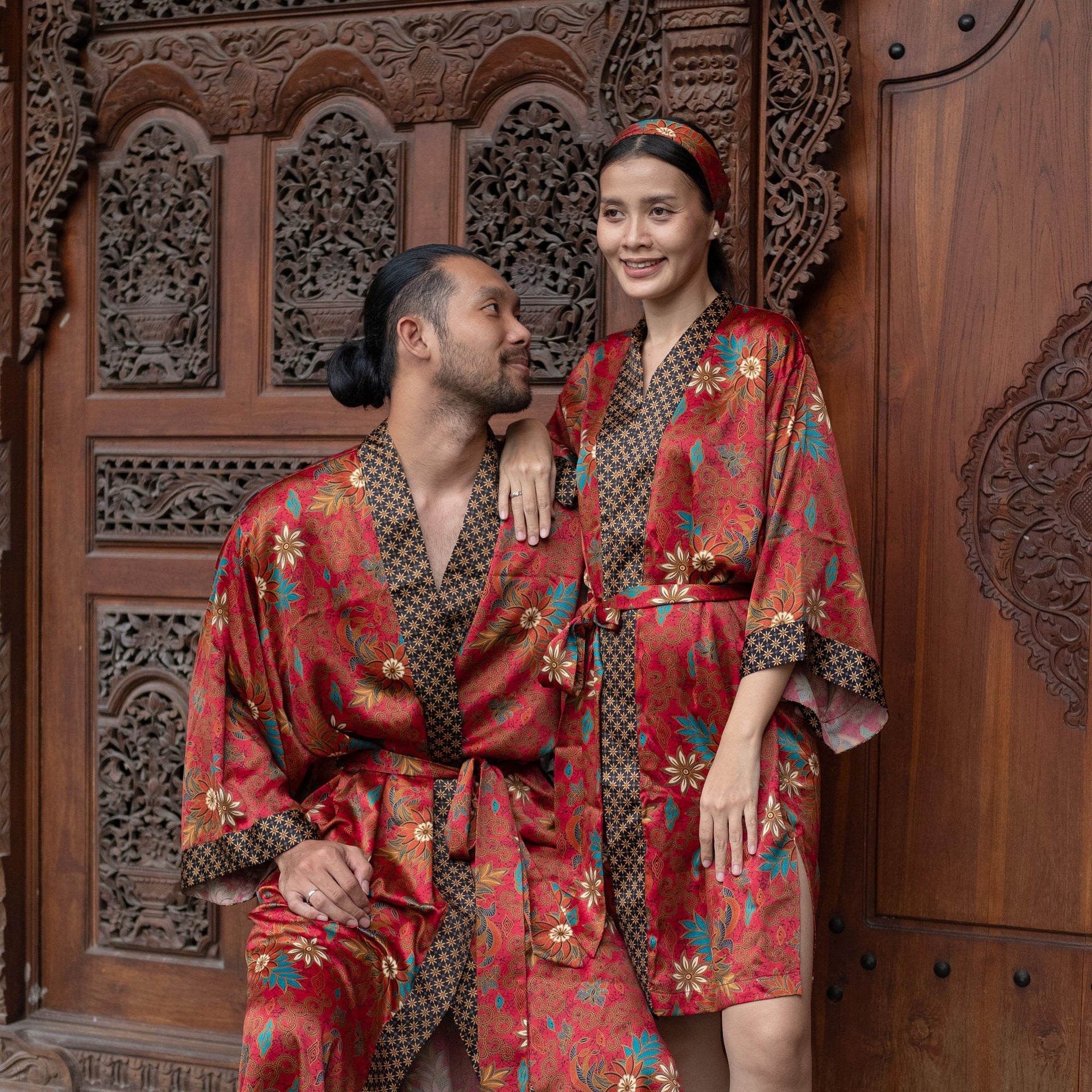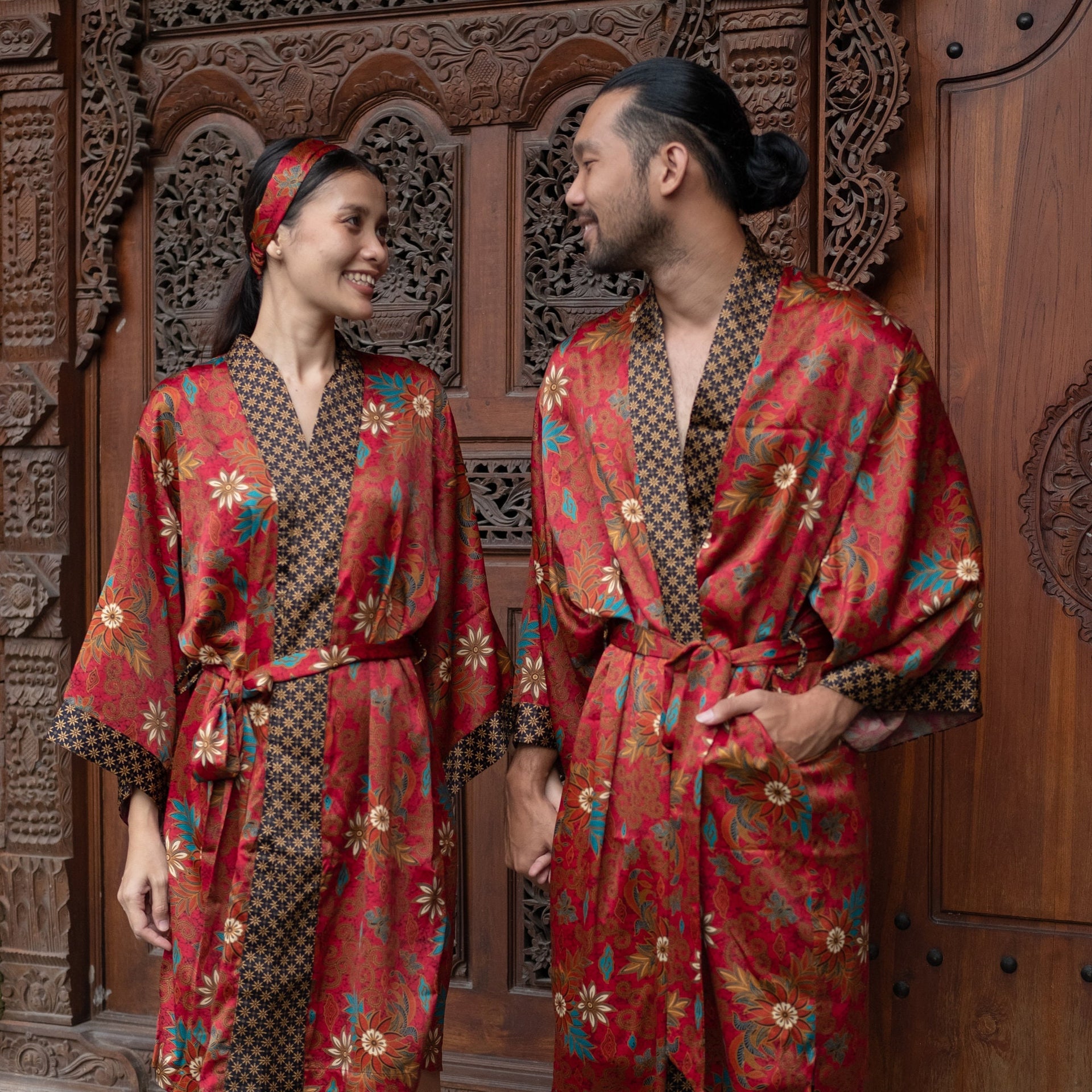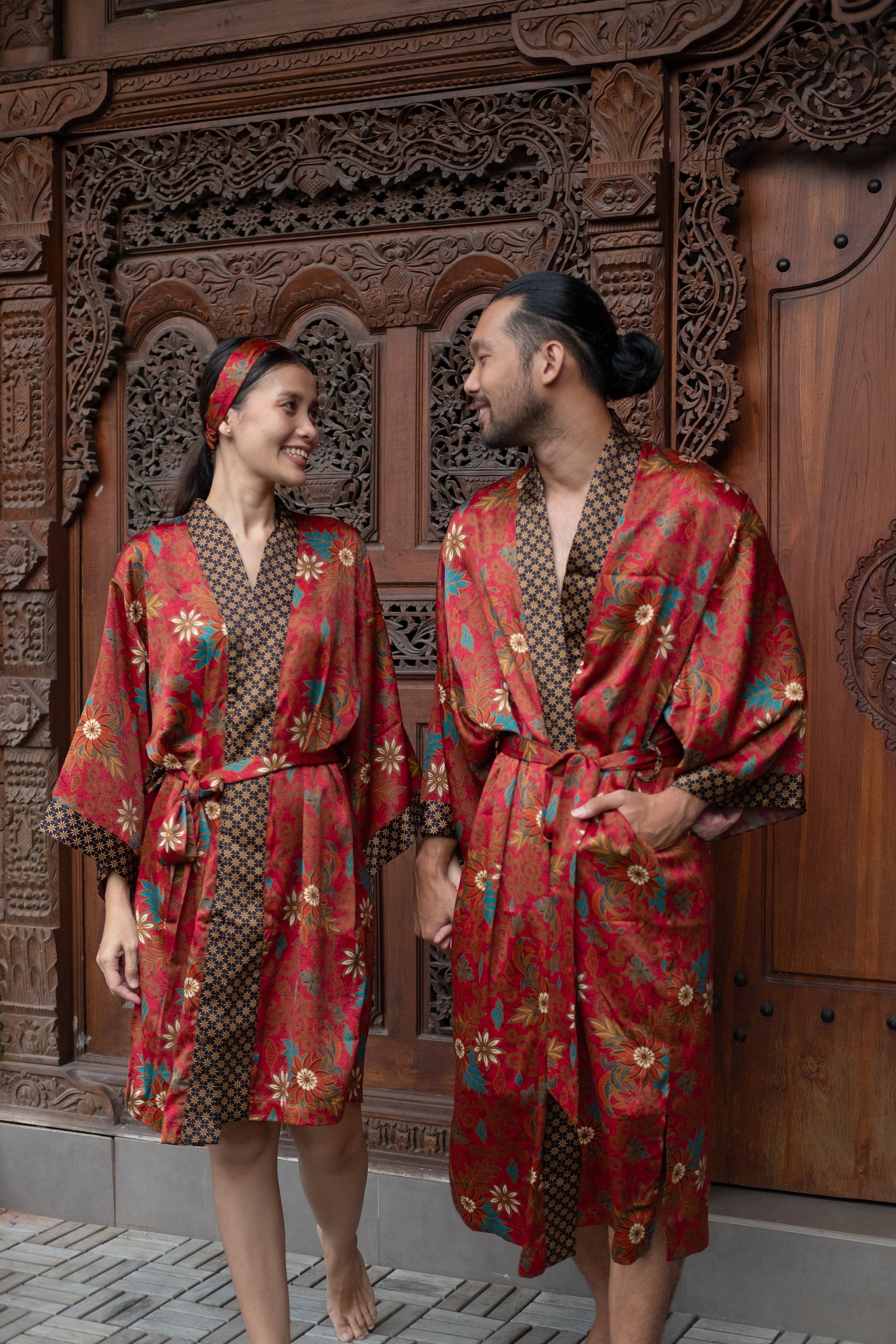 Each silk blend kimono robe features a vibrant hand-printed Bali Batik design that combines boho style with timeless sophistication. The red kimono robes come with matching headbands and are ideal as a gift for him and her. Perfect for resort vacations, weddings, or cozy evenings, these his and hers kimonos wrap you both in luxurious softness and style.