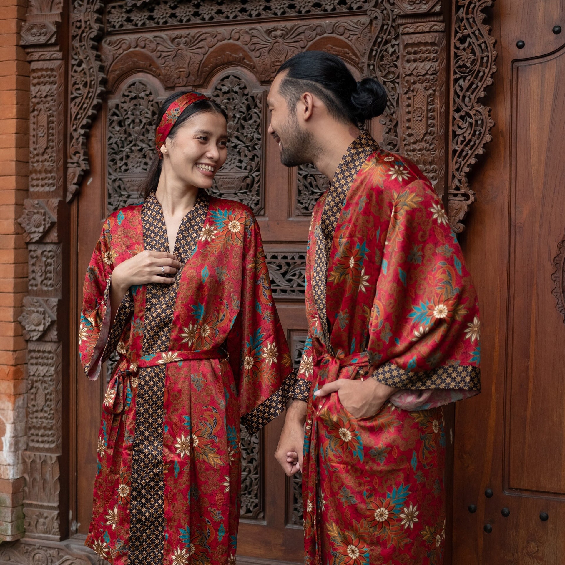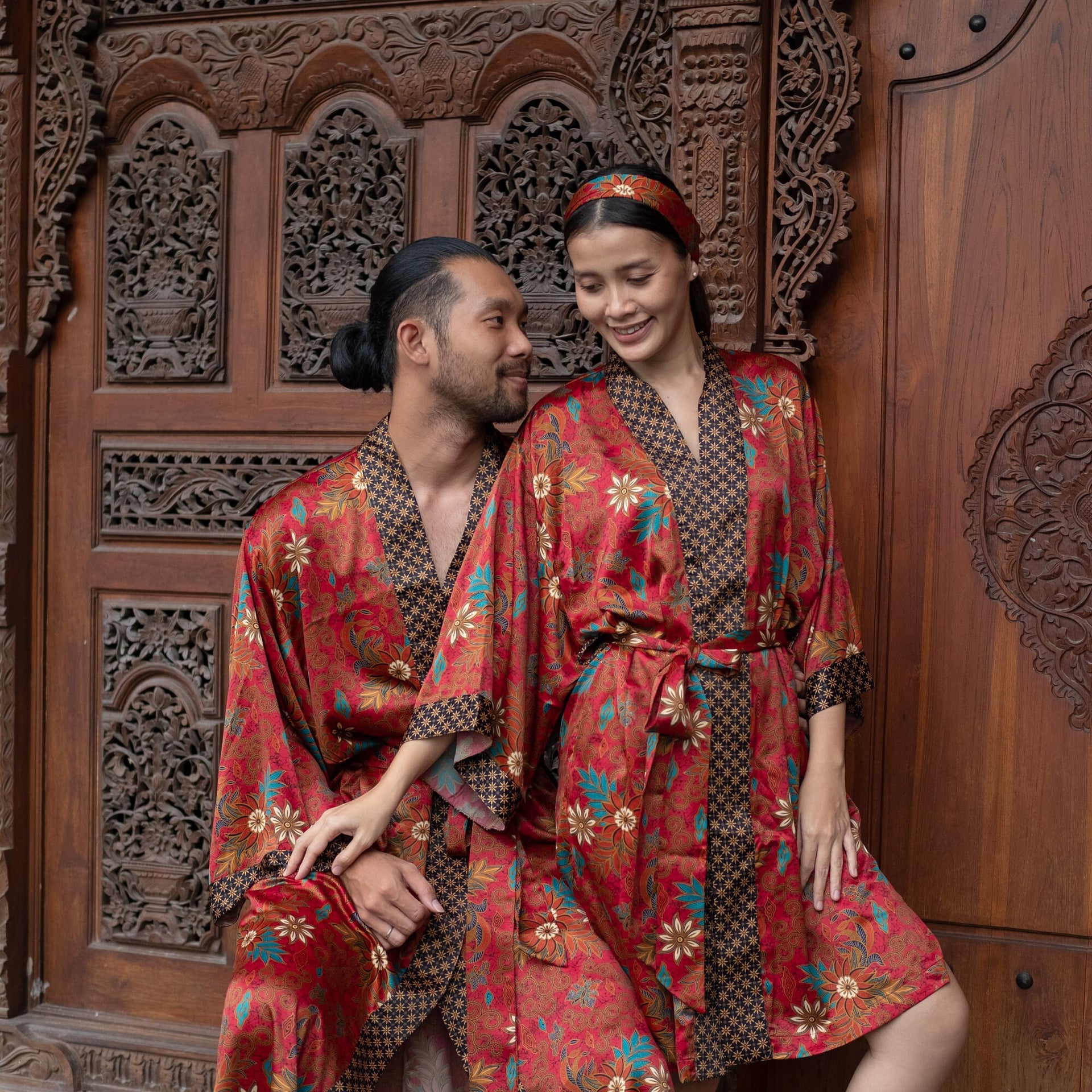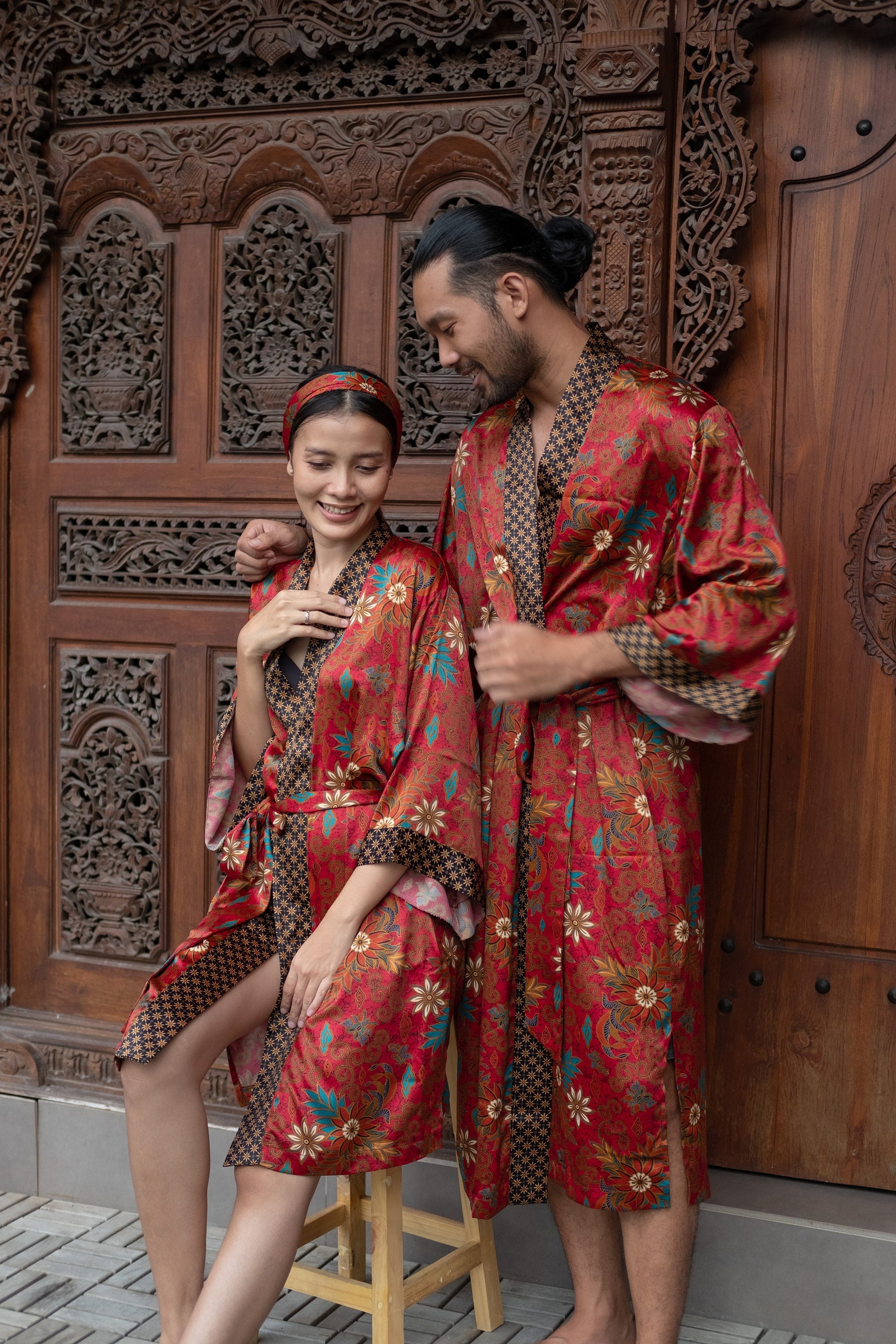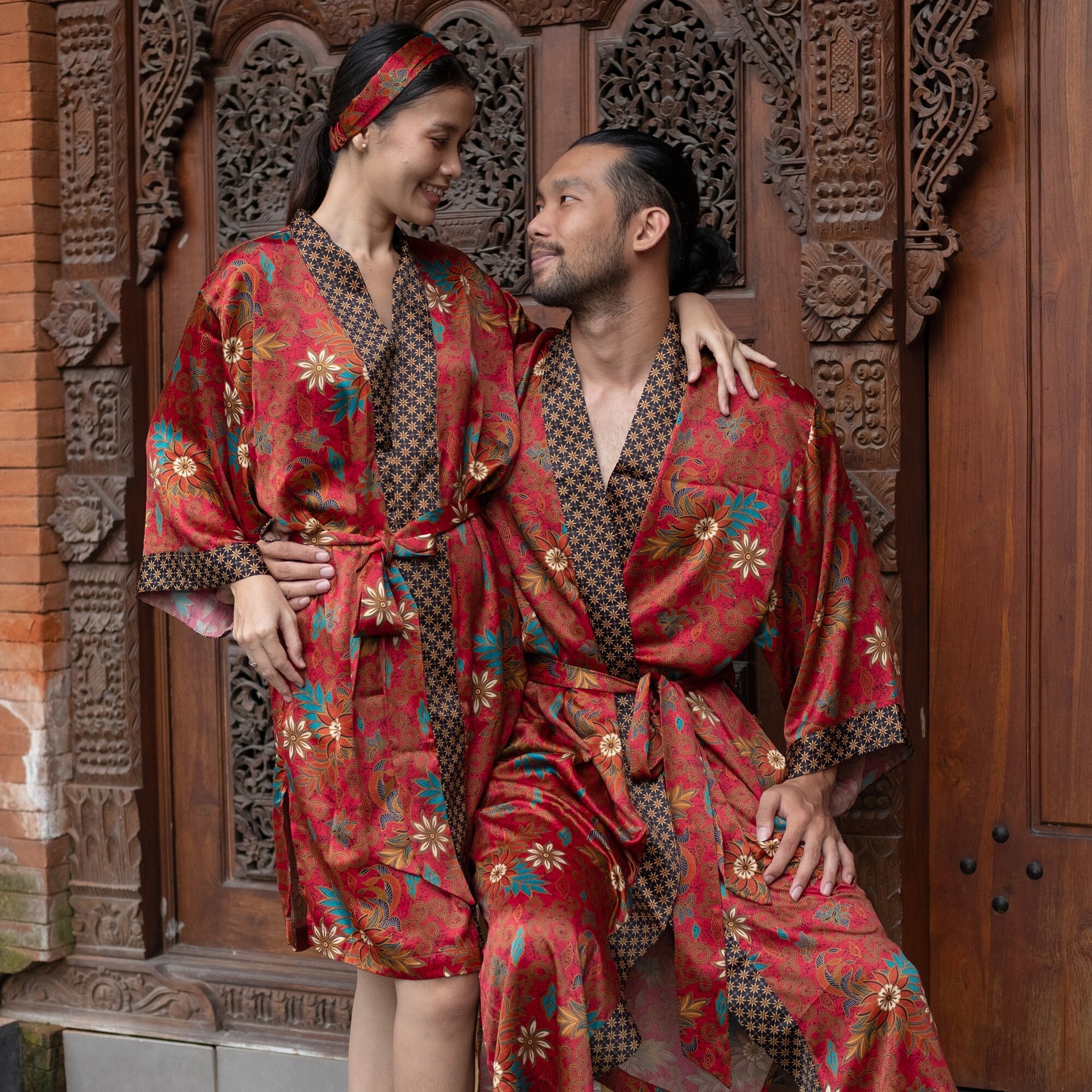 Each silk blend kimono robe features a vibrant hand-printed Bali Batik design that combines boho style with timeless sophistication. The red kimono robes come with matching headbands and are ideal as a gift for him and her. Perfect for resort vacations, weddings, or cozy evenings, these his and hers kimonos wrap you both in luxurious softness and style.