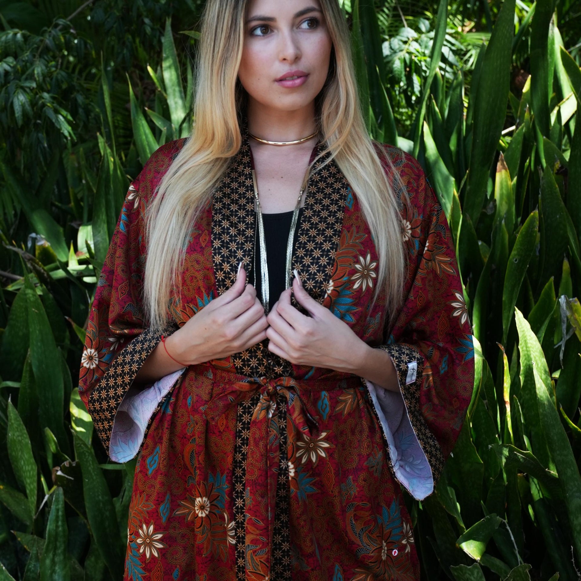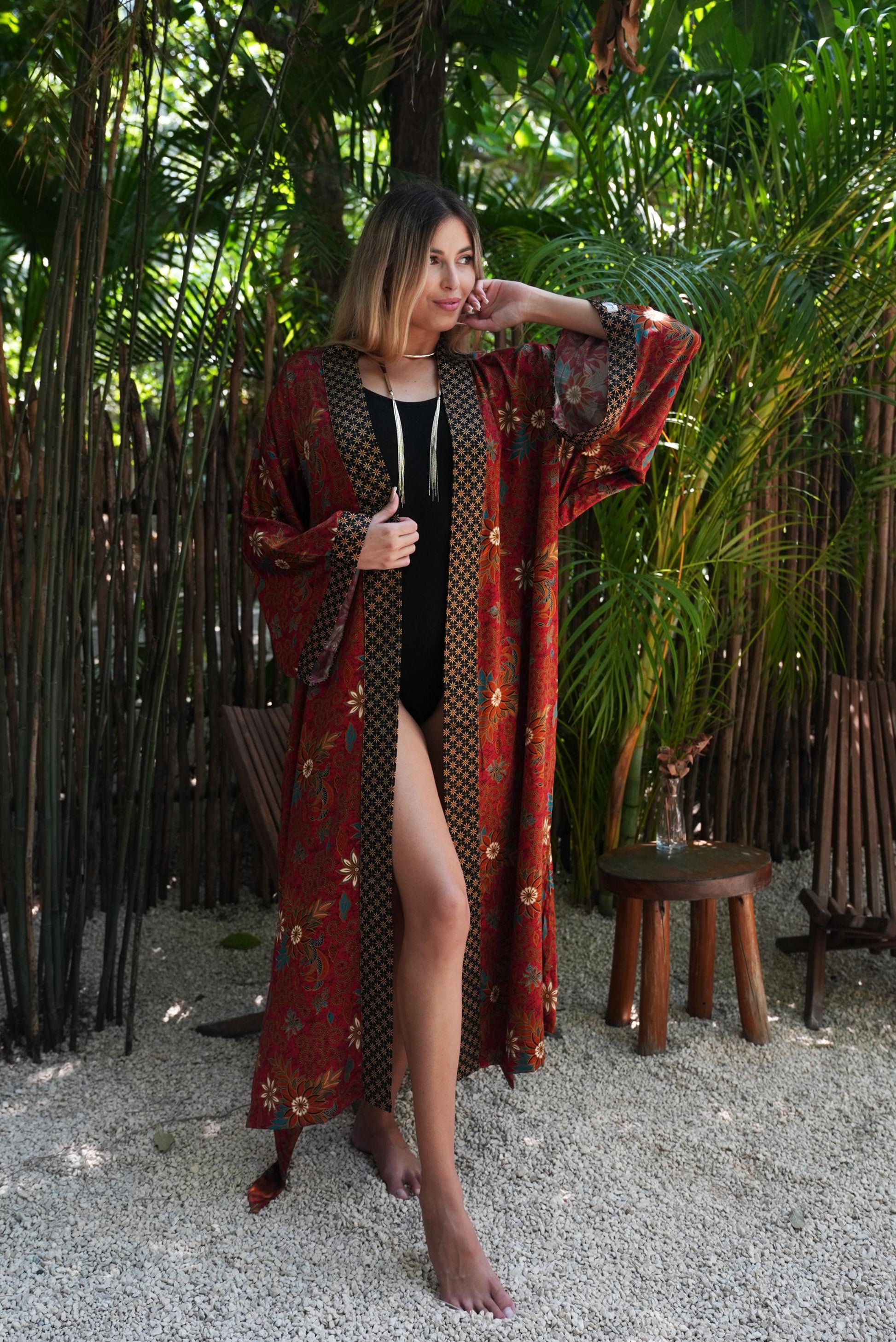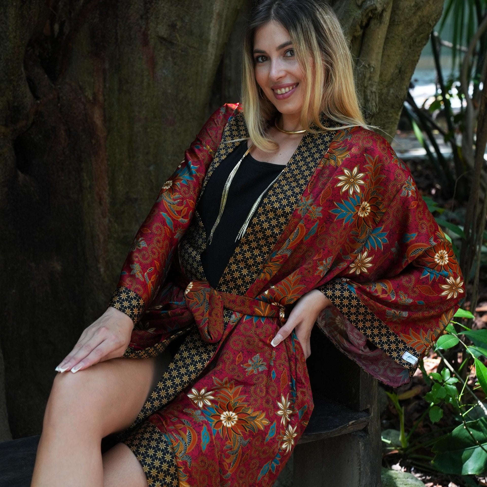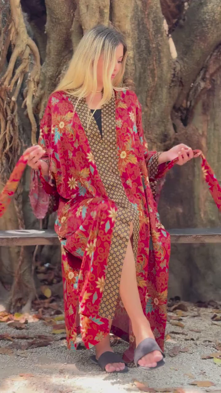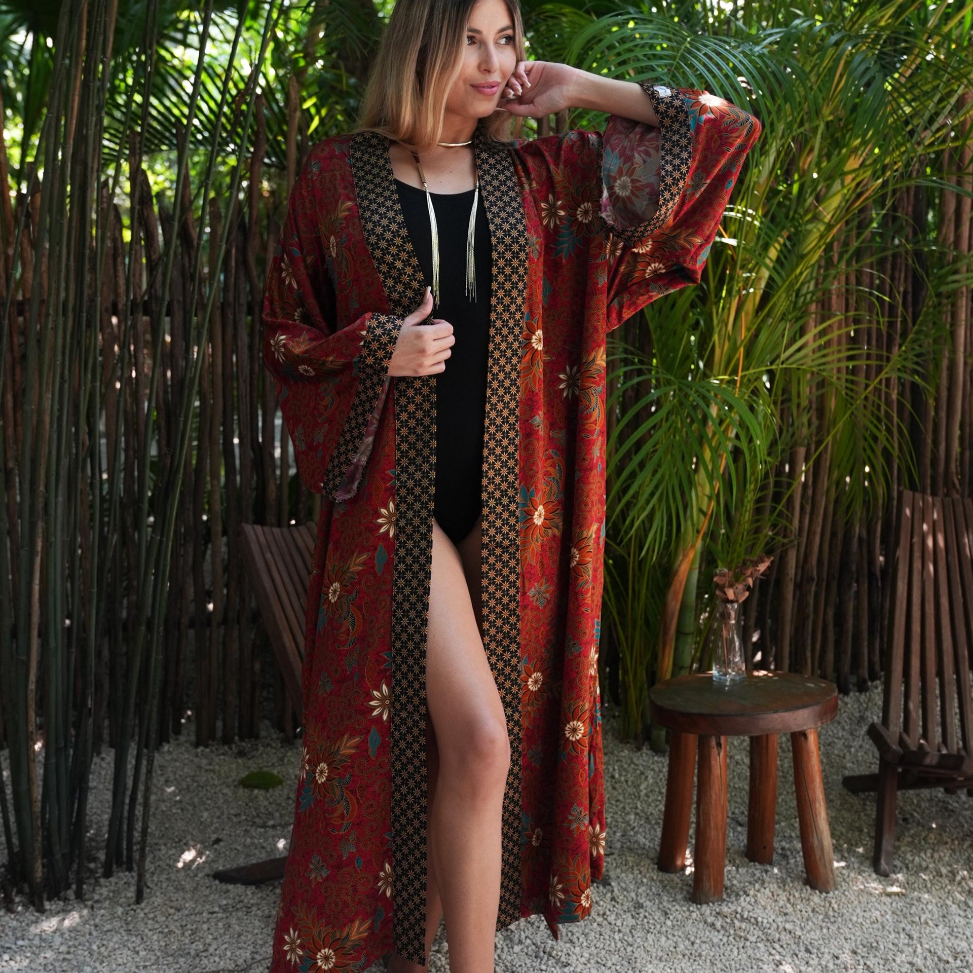Wrap yourself in timeless elegance with this handmade Bali Boho style long silk kimono robe, created and using the ancient art of batik.