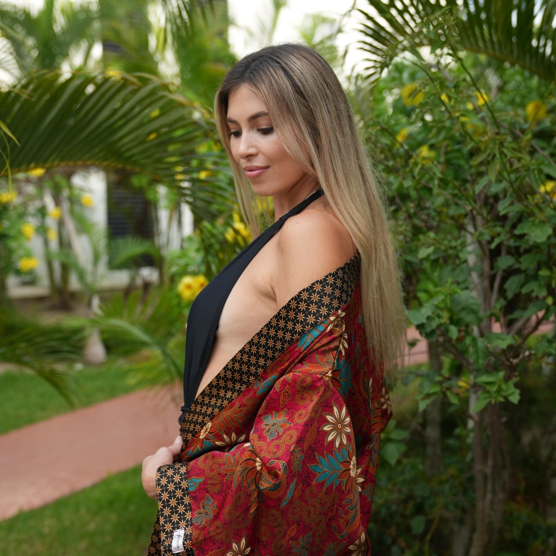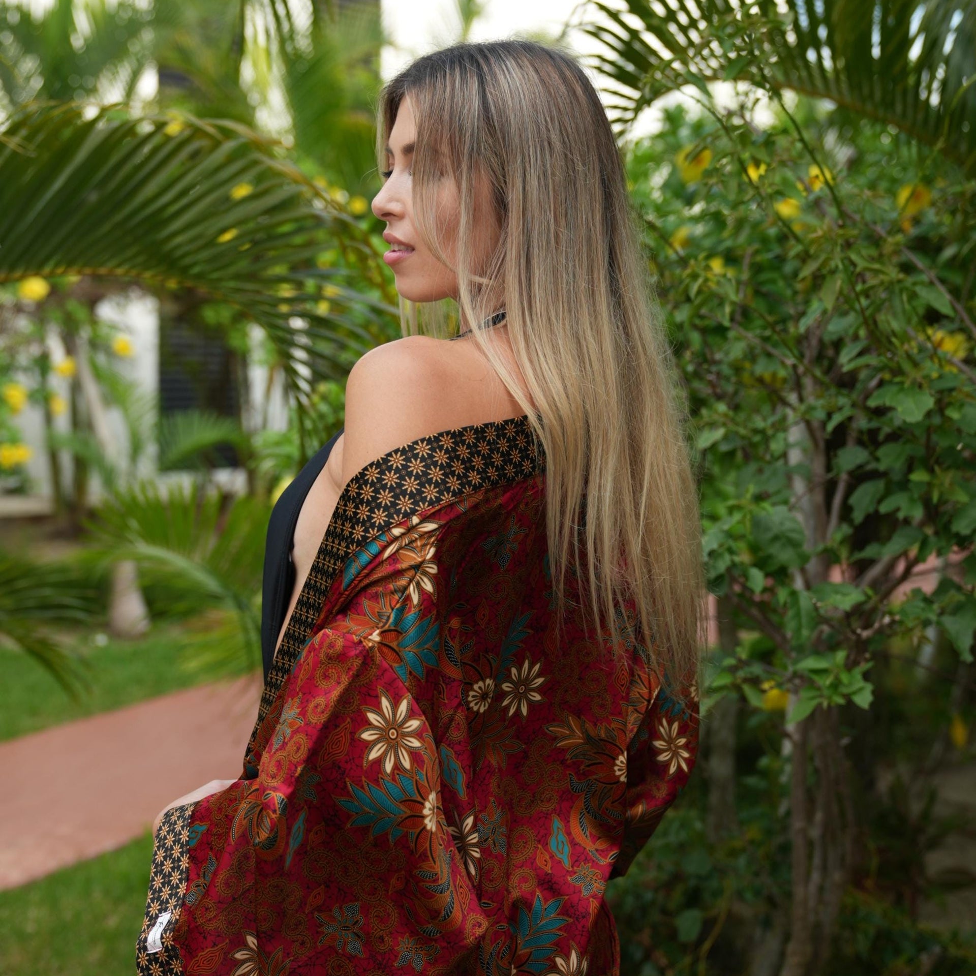 Silk pajama set , Red kimono robe for women set, Bali batik silk mix, gift for Christmas , festival clothing
