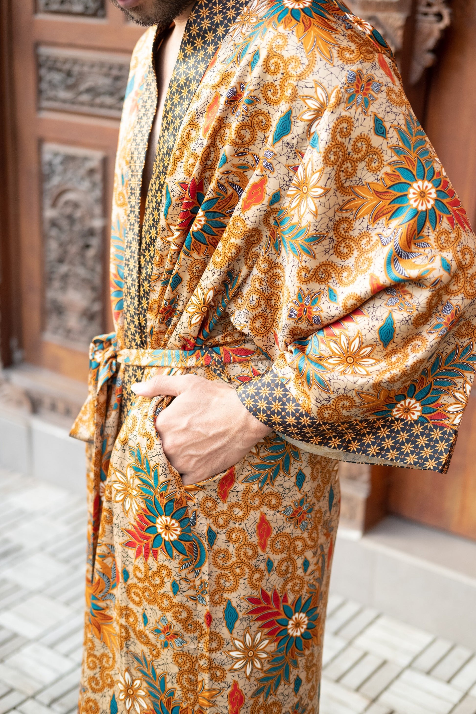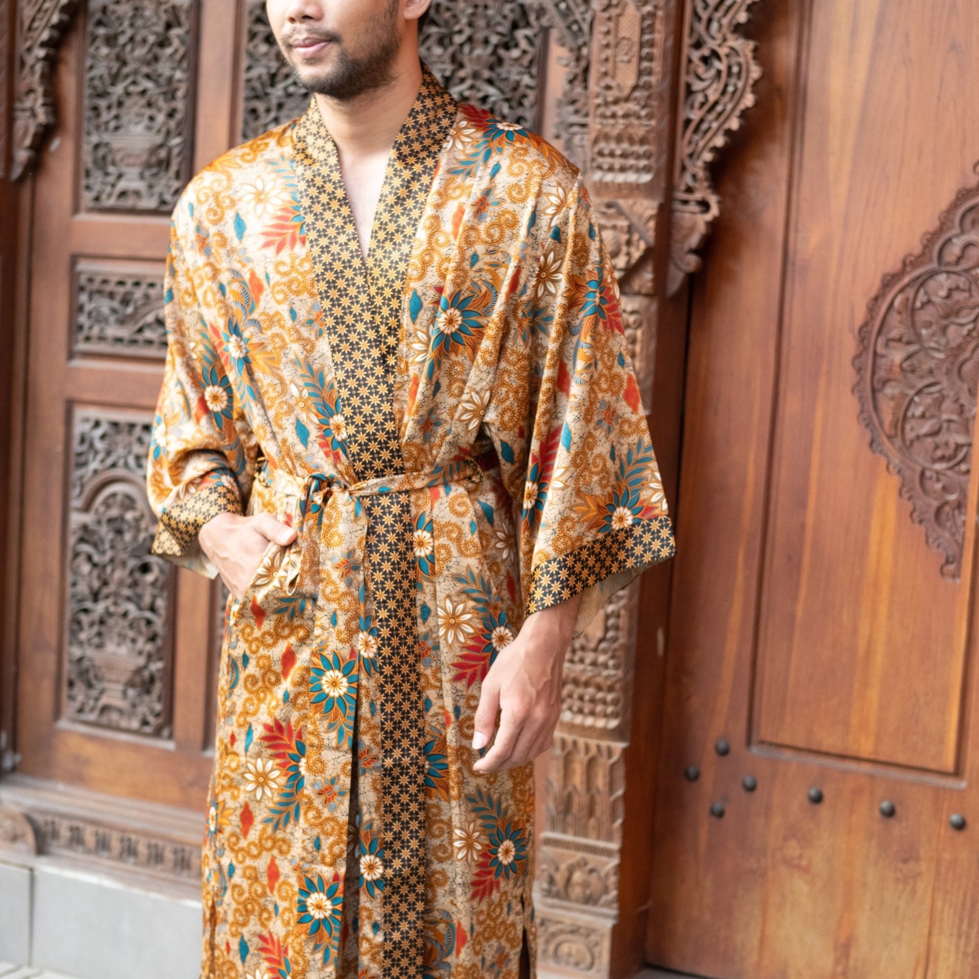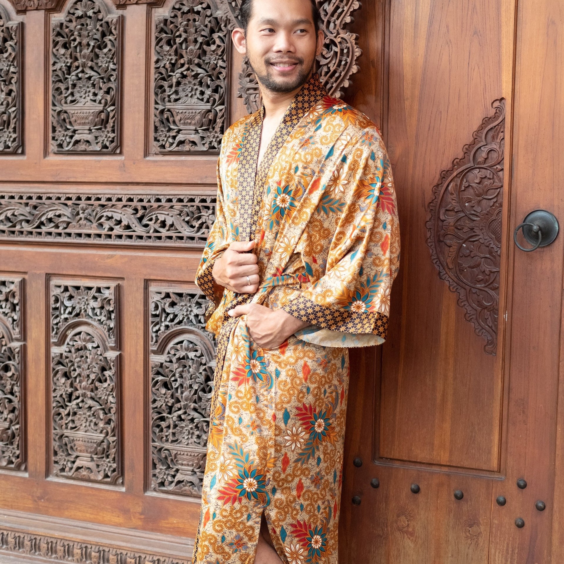 Bring romance and luxury into your life with our Bali Batik Atlas Silk Kimono Robe, made from unique Java fabric that’s both soft and exquisitely draped. This boho-style, full-length kaftan kimono is a perfect addition to any wardrobe, suitable for festivals, beach parties, Pride parades, or simply unwinding at home in style. Lightweight and delicately hand-crafted, it is the ideal gift for anyone who loves the finer, luxurious moments in life.