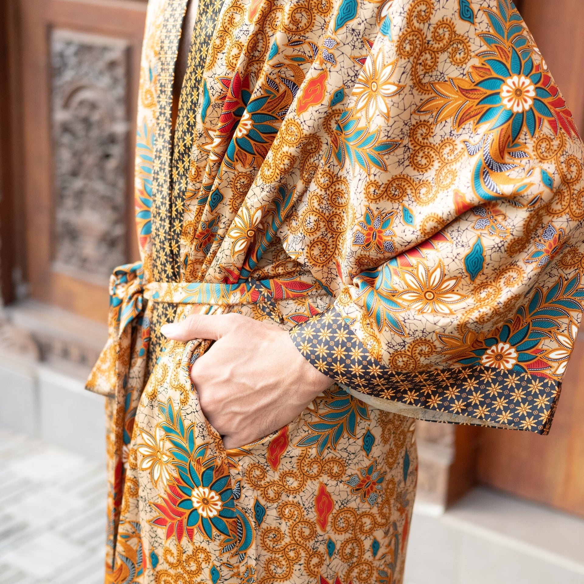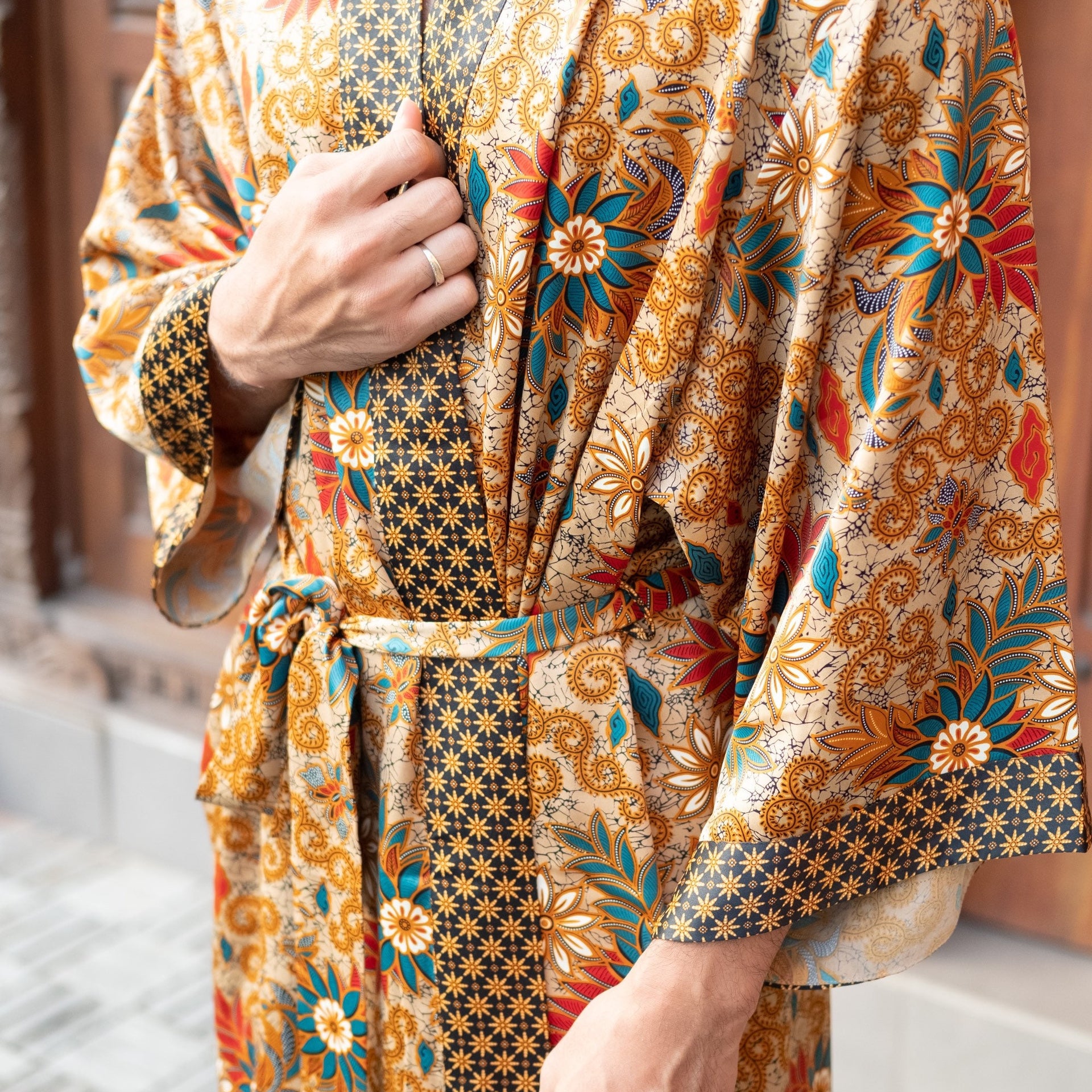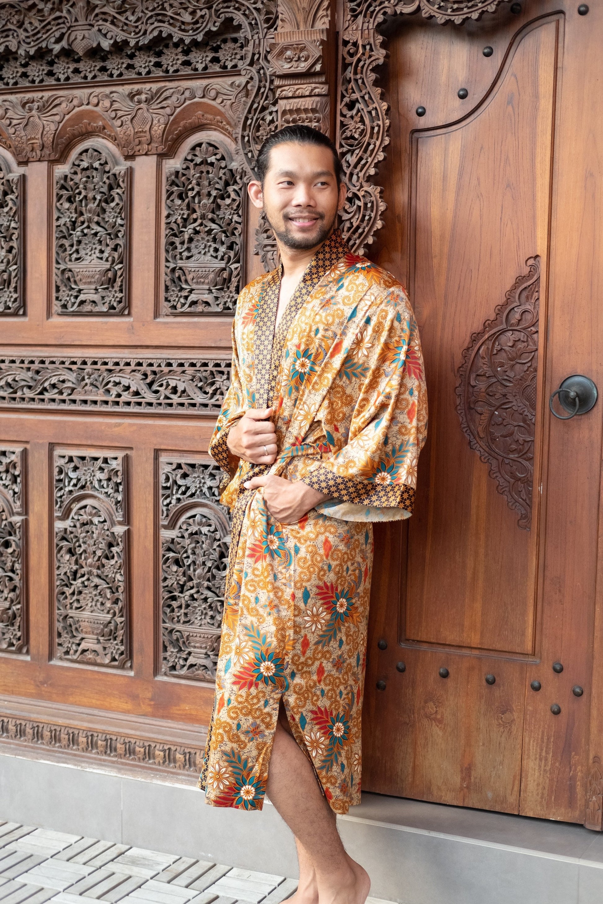 Bring romance and luxury into your life with our Bali Batik Atlas Silk Kimono Robe, made from unique Java fabric that’s both soft and exquisitely draped. This boho-style, full-length kaftan kimono is a perfect addition to any wardrobe, suitable for festivals, beach parties, Pride parades, or simply unwinding at home in style. Lightweight and delicately hand-crafted, it is the ideal gift for anyone who loves the finer, luxurious moments in life.