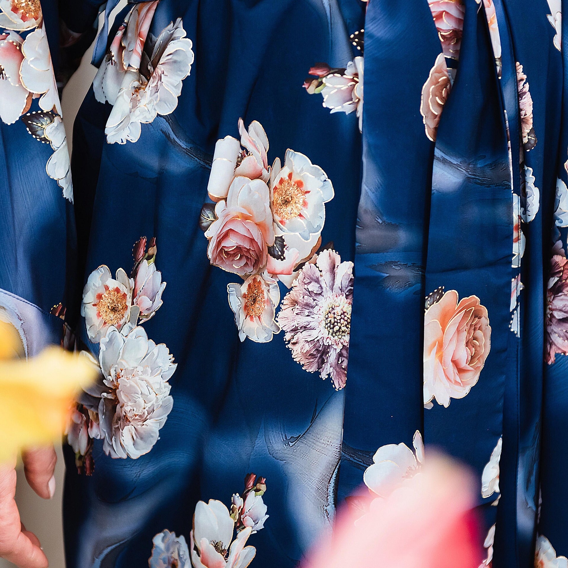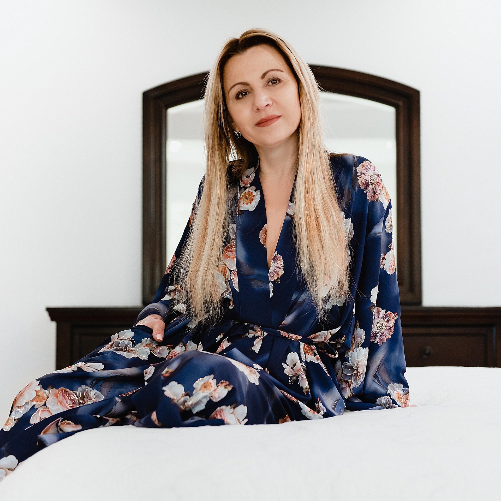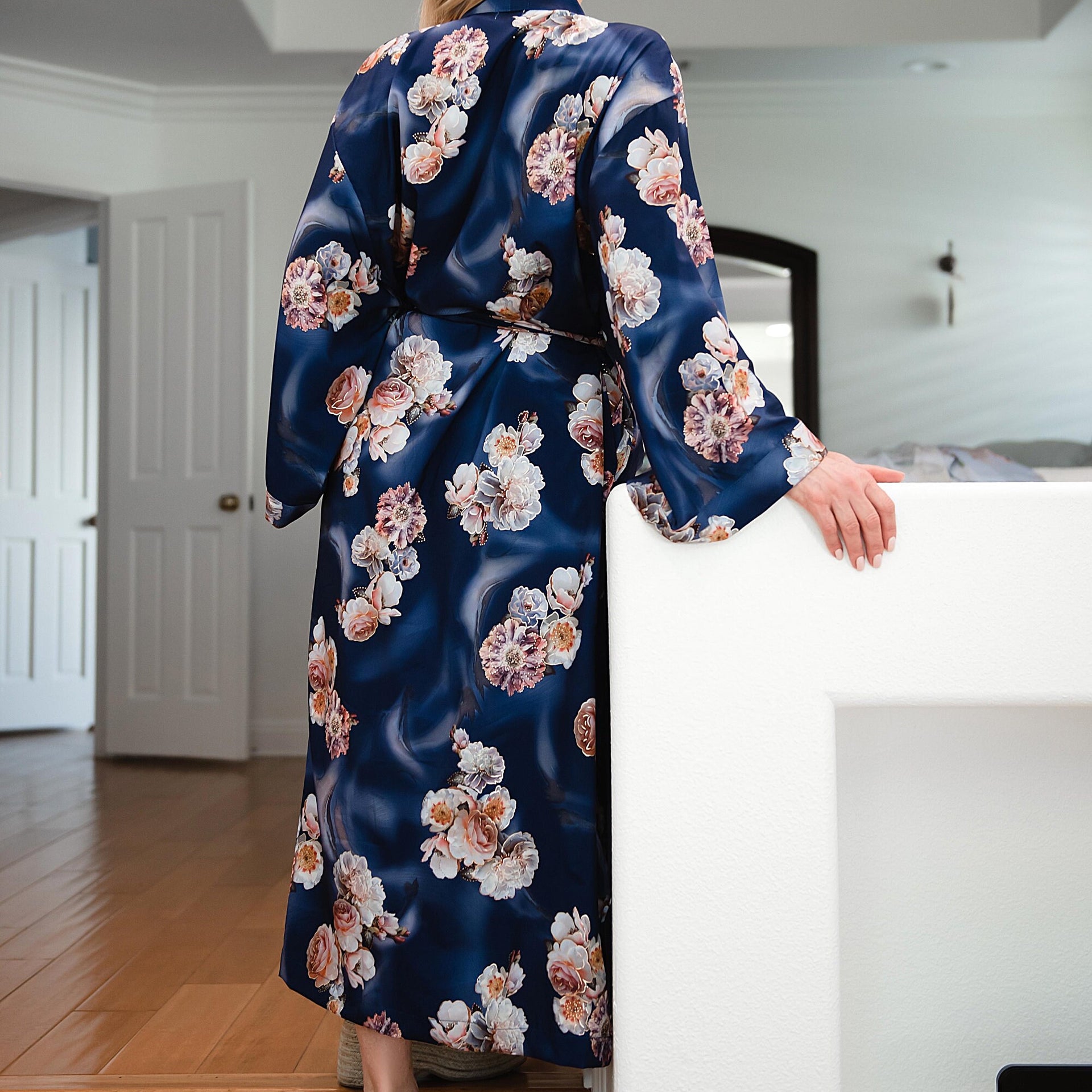 A blue silk kimono robe kaftan makes a stunning choice for a bridal robe or a luxurious addition to your vacation wardrobe.