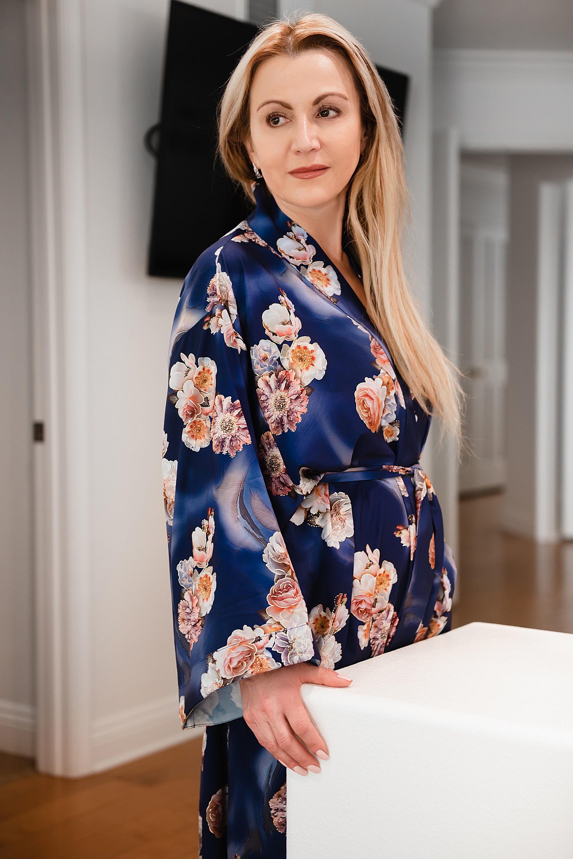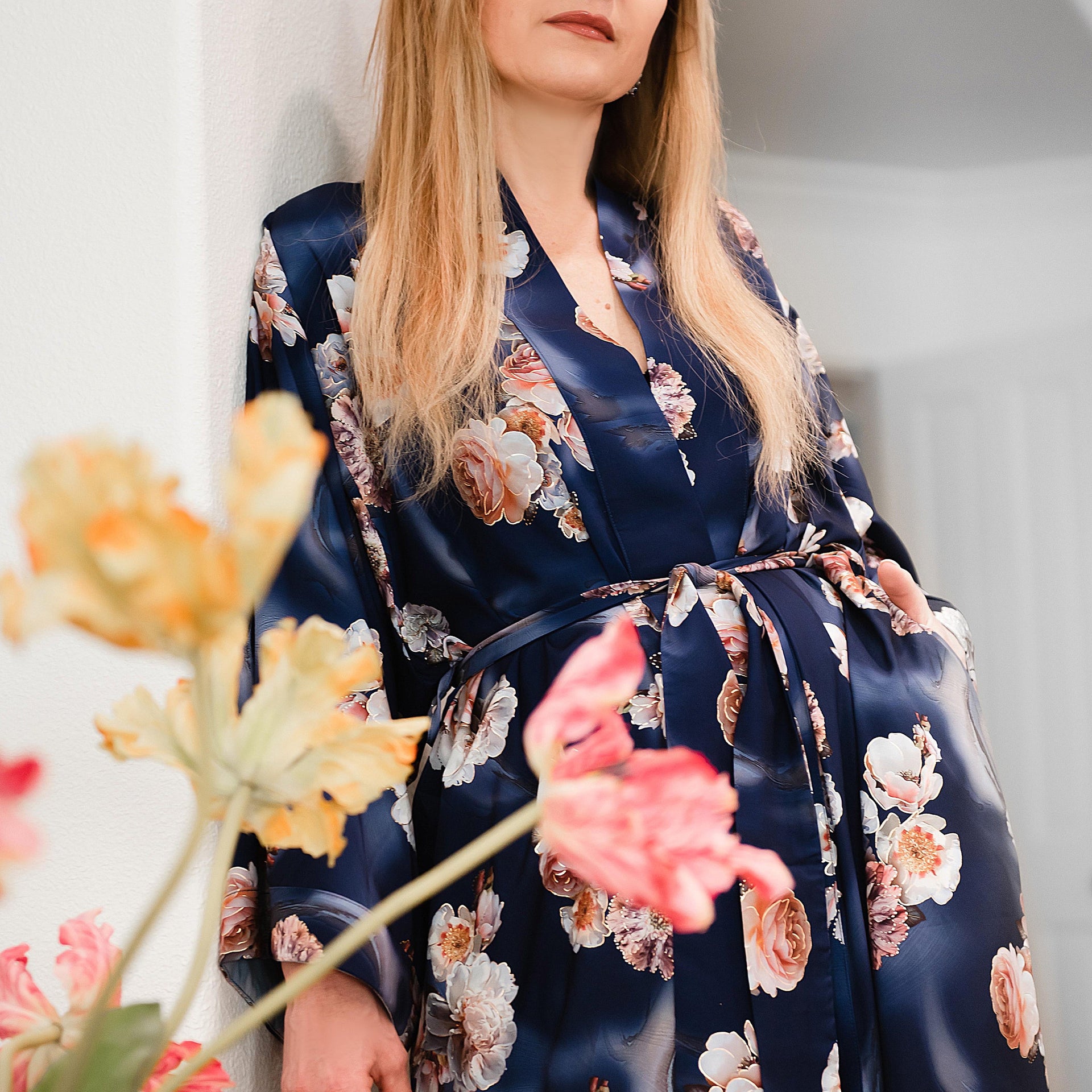 For care, handle this garment delicately. Avoid using a hot iron to maintain the fabric‘s softness and integrity. Whether worn at home or for special occasions, this blue silk kimono robe kaftan promises to envelop her in luxury and elegance.