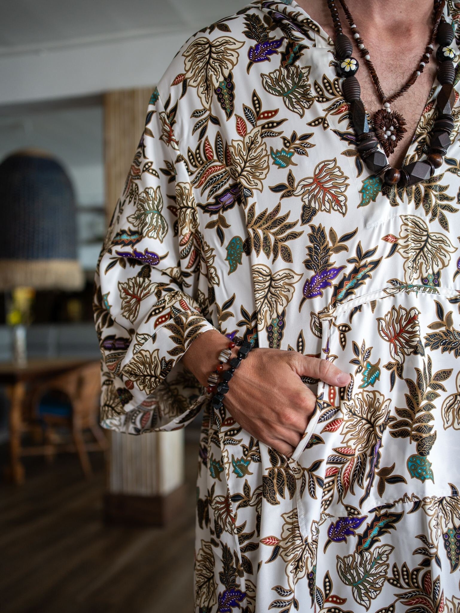 Available in sizes M, L, XL-XXL, with special orders for girls‘ sizes S and M, these kaftans drape beautifully with intricate patterns. Whether for special occasions or casual wear, they exude refinement and charm for all genders. Luxury Balinese Atlas silk blend Kimono-Robes add romance to life, ideal as Valentine‘s gifts, perfect for couples or individual wear for honeymoons, vacations, and everyday luxury.