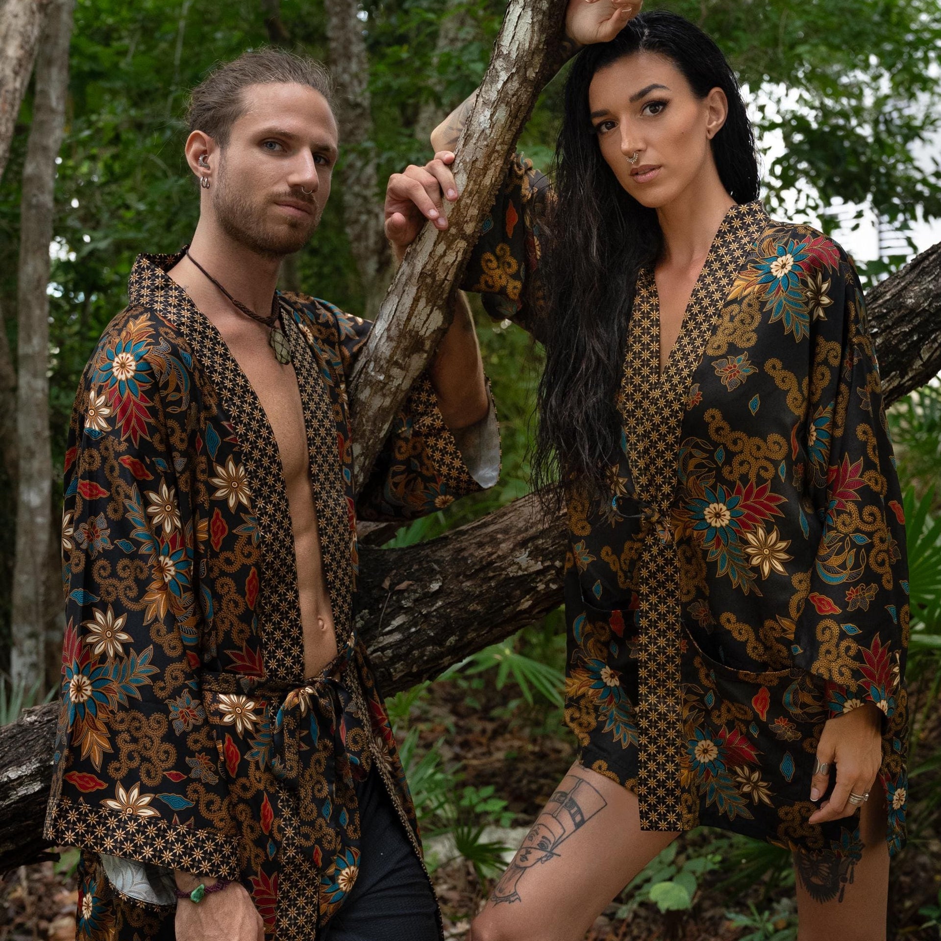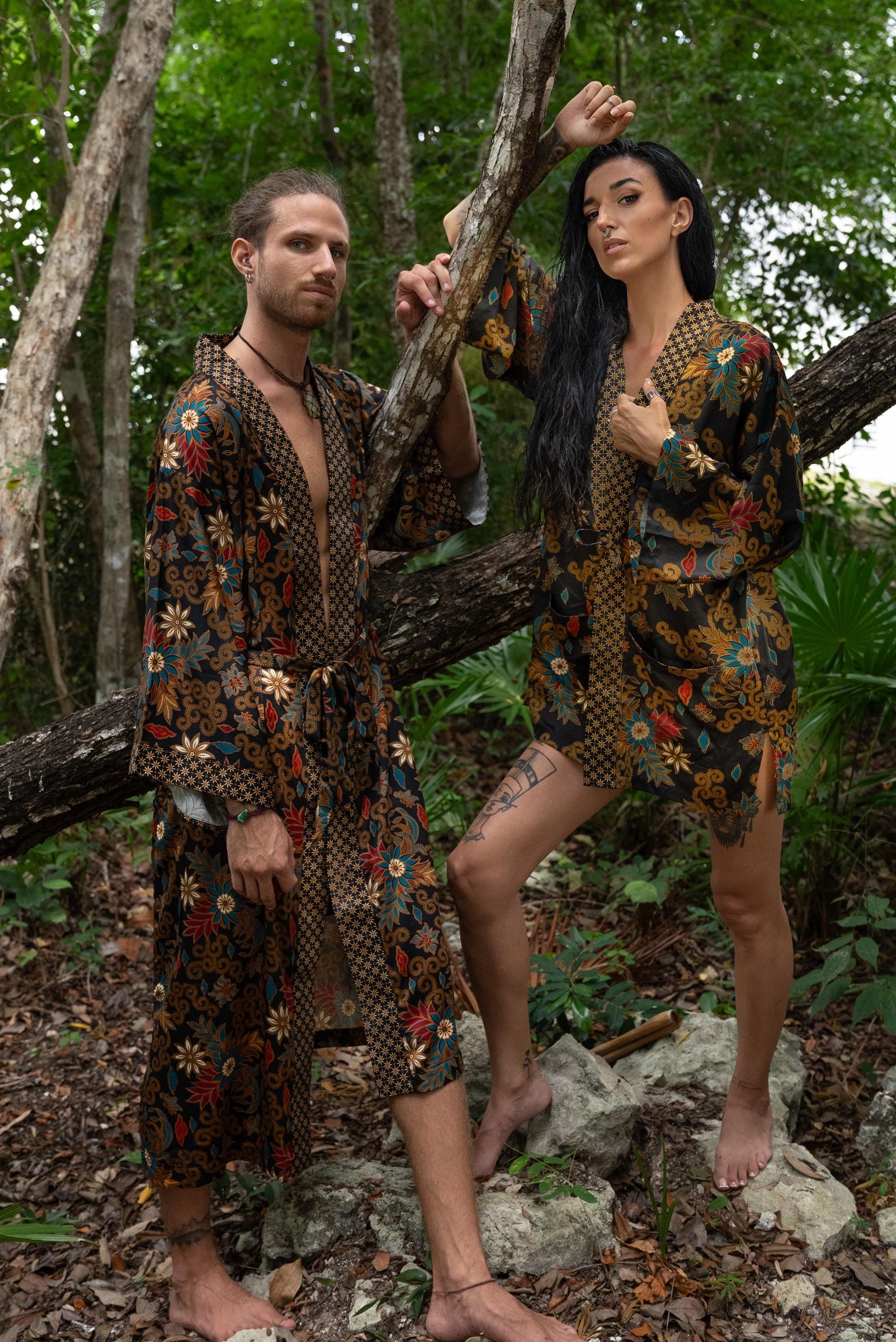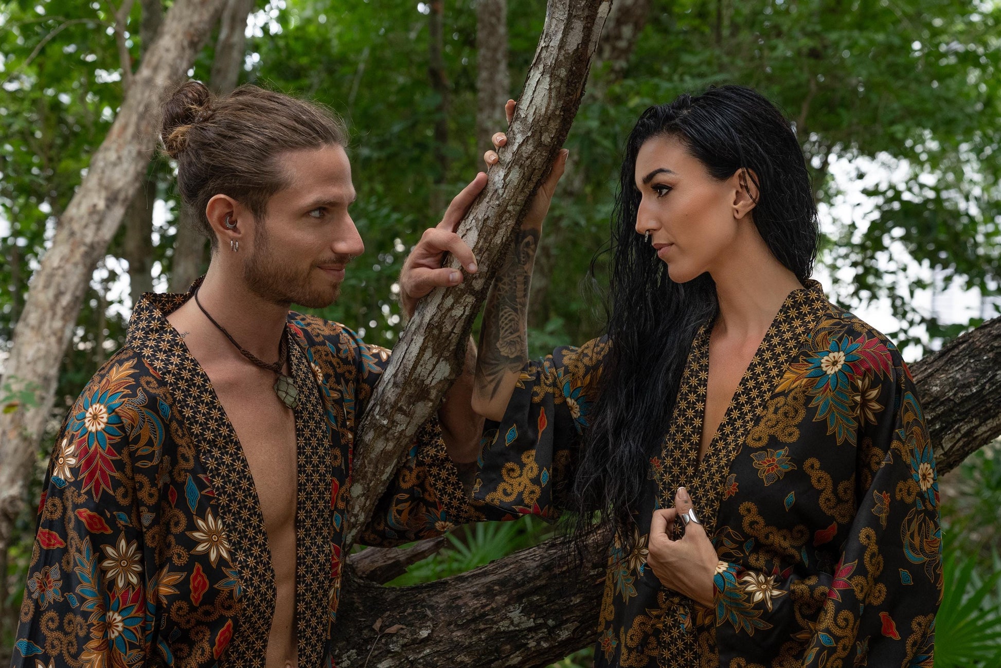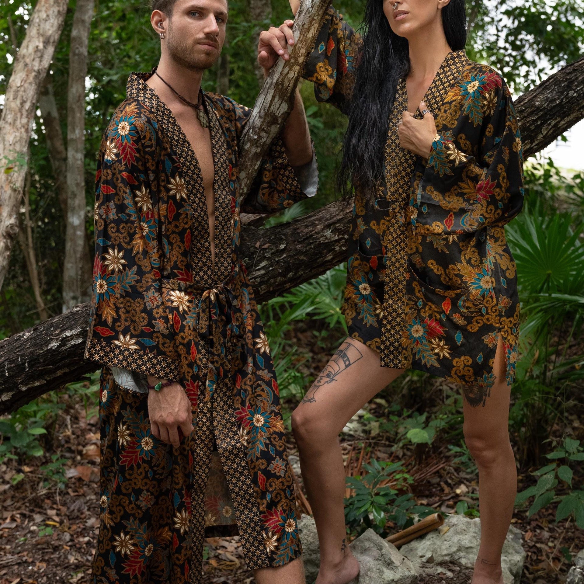 Each silk blend kimono robe features a vibrant hand-printed Bali Batik design that combines boho style with timeless sophistication. The red kimono robes come with matching headbands and are ideal as a gift for him and her. Perfect for resort vacations, weddings, or cozy evenings, these his and hers kimonos wrap you both in luxurious softness and style.