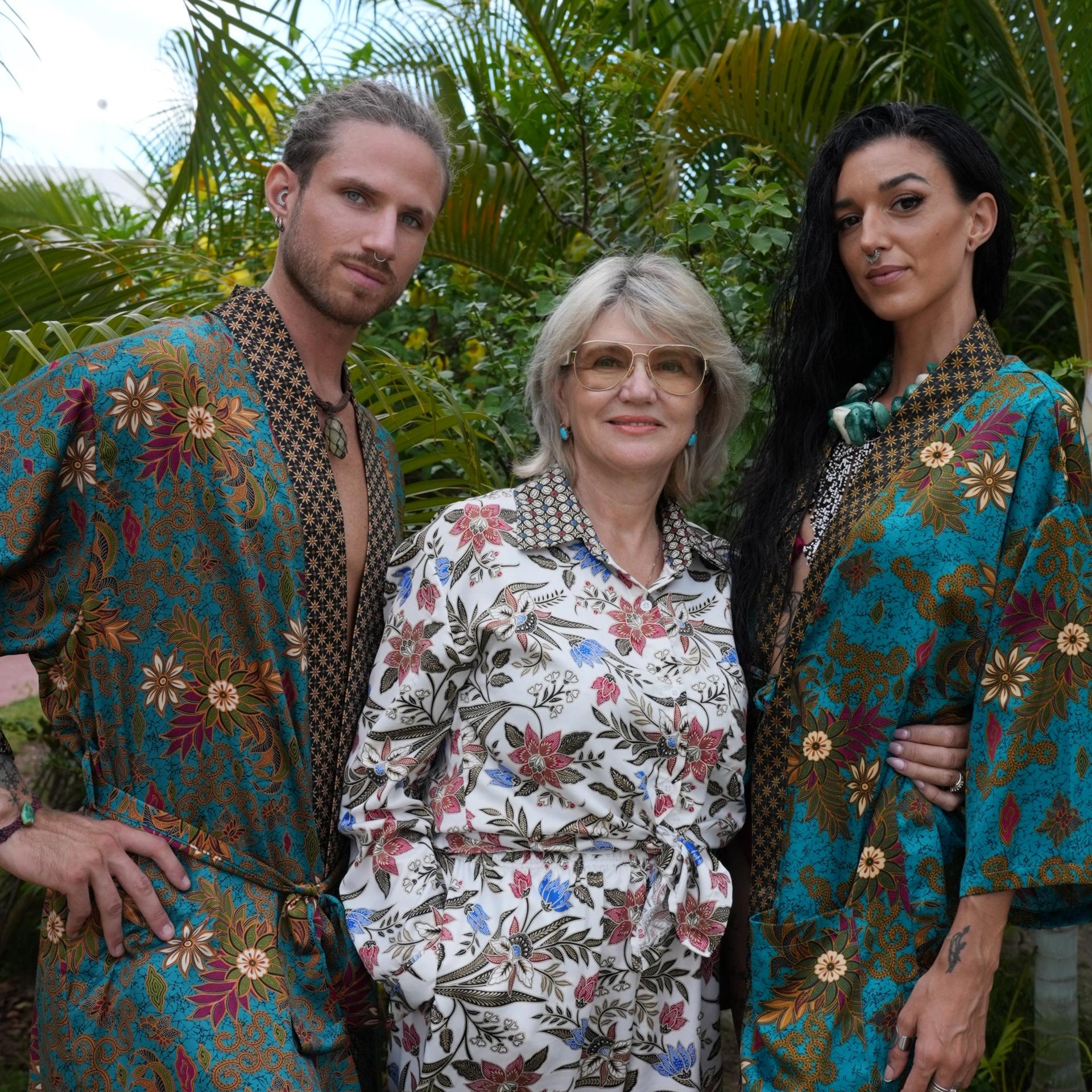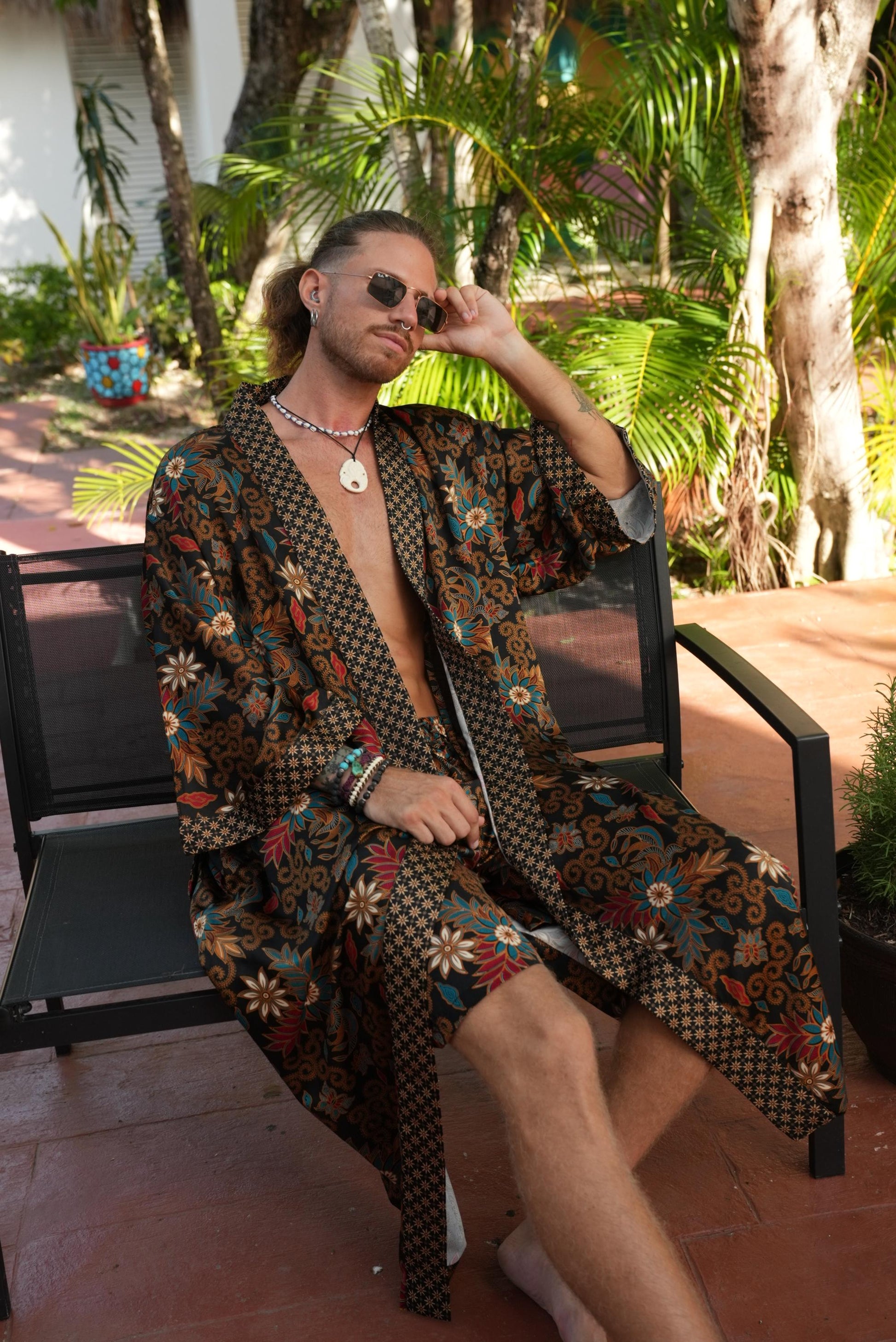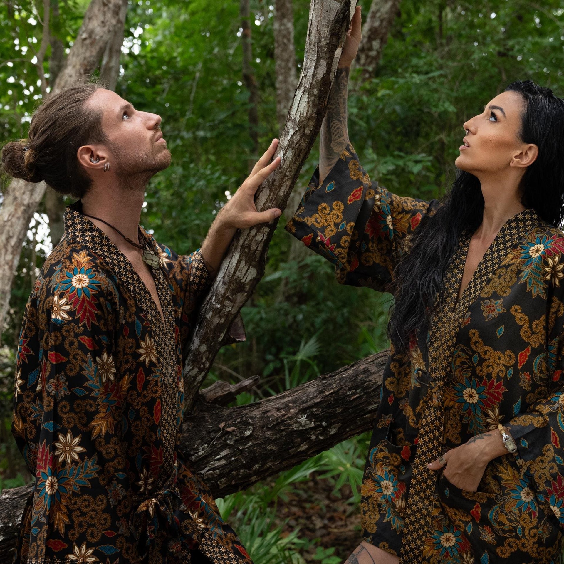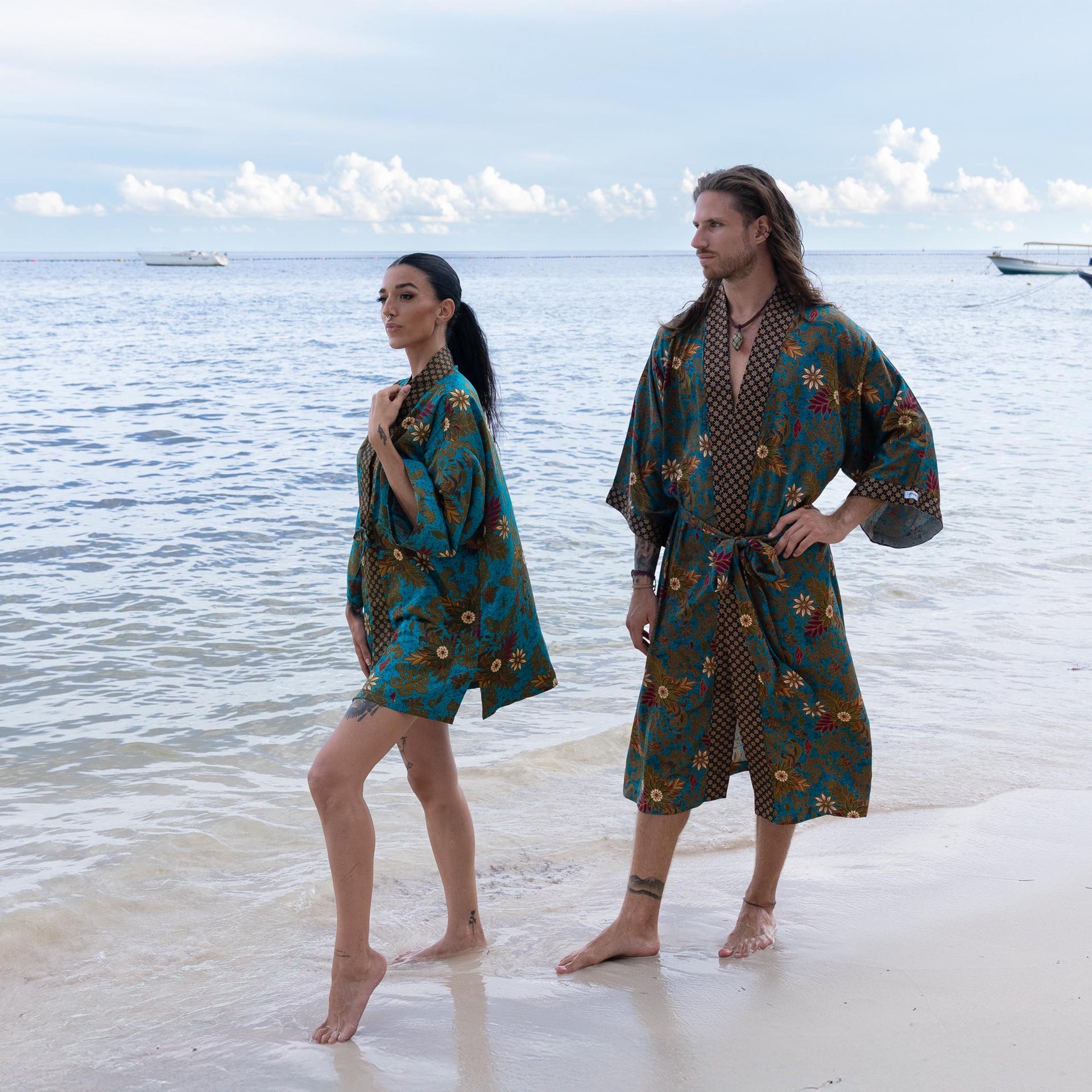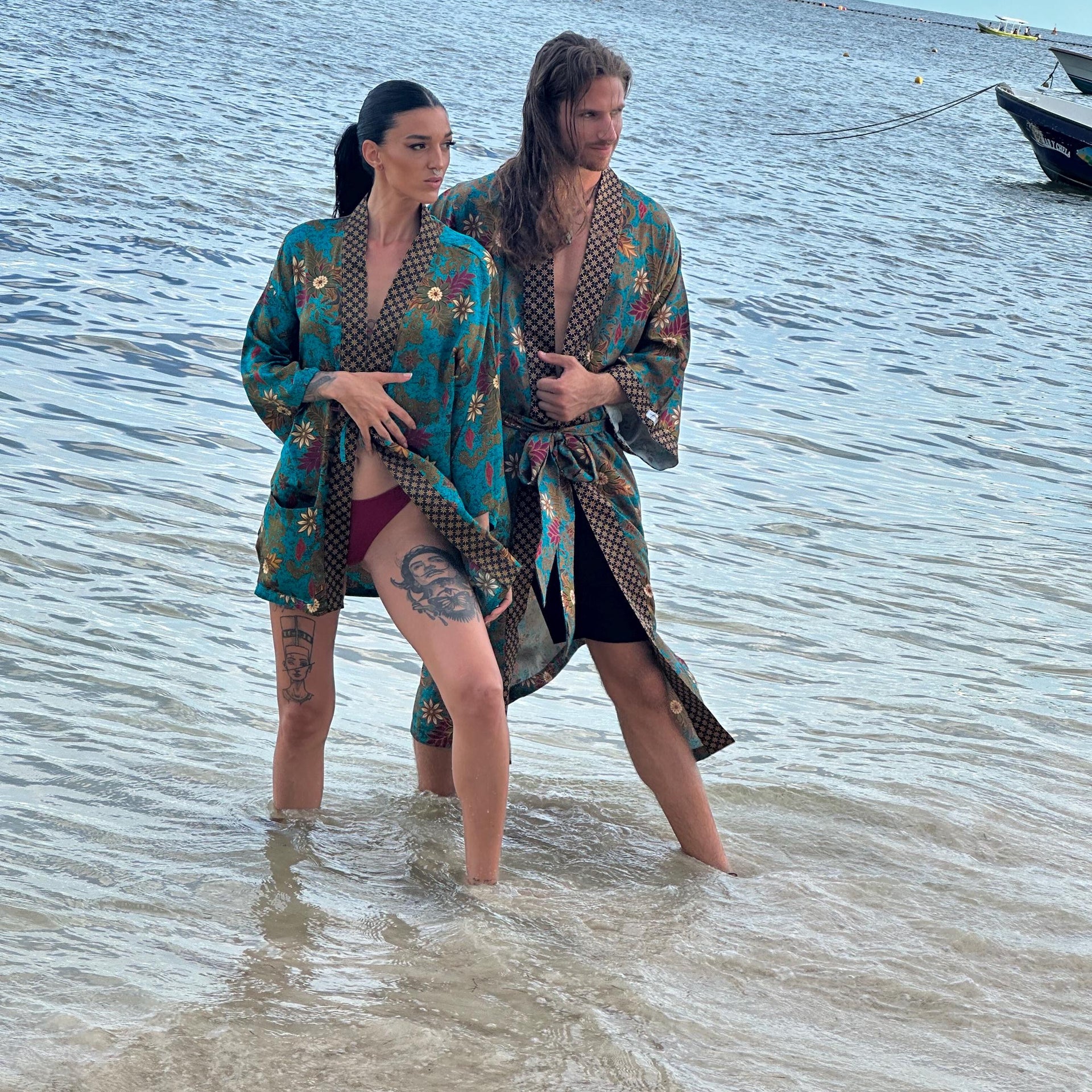 Each silk blend kimono robe features a vibrant hand-printed Bali Batik design that combines boho style with timeless sophistication. The red kimono robes come with matching headbands and are ideal as a gift for him and her. Perfect for resort vacations, weddings, or cozy evenings, these his and hers kimonos wrap you both in luxurious softness and style.