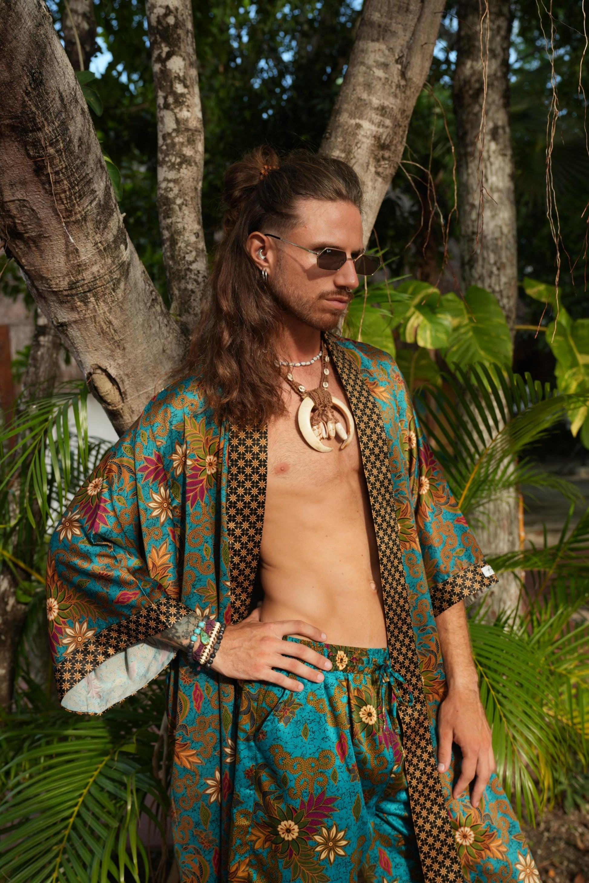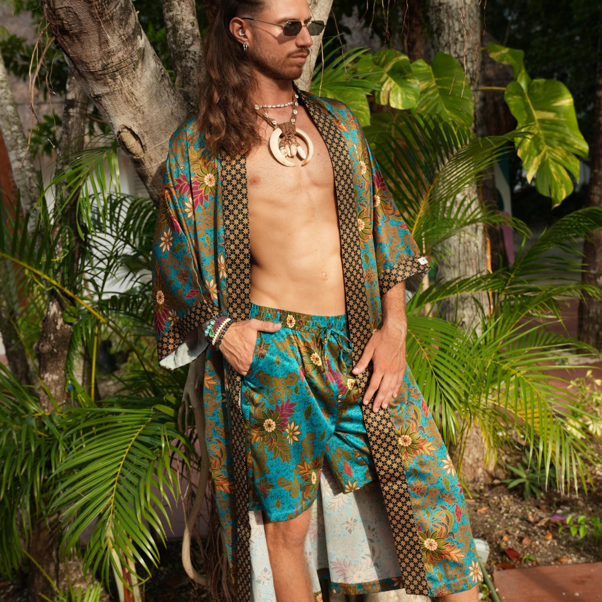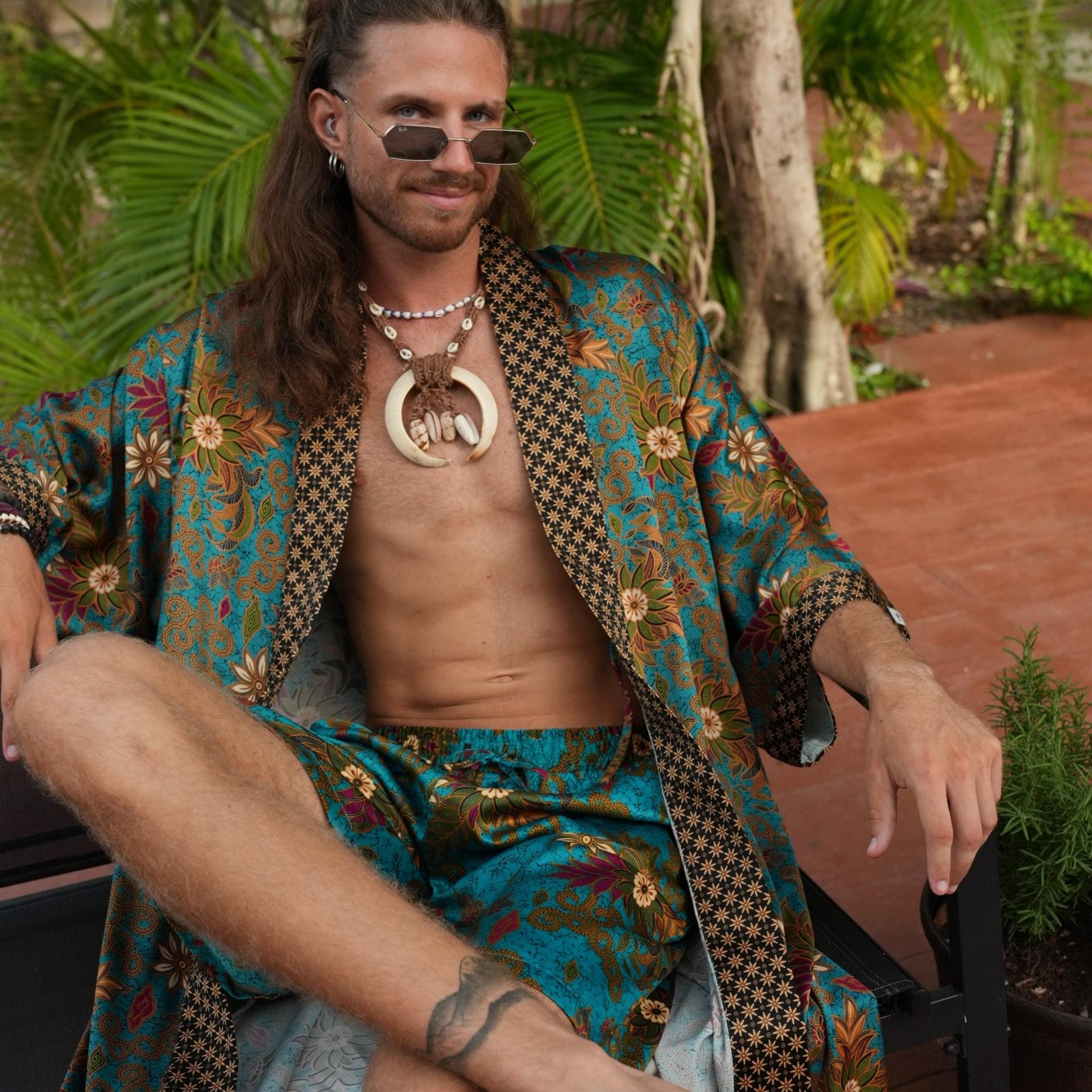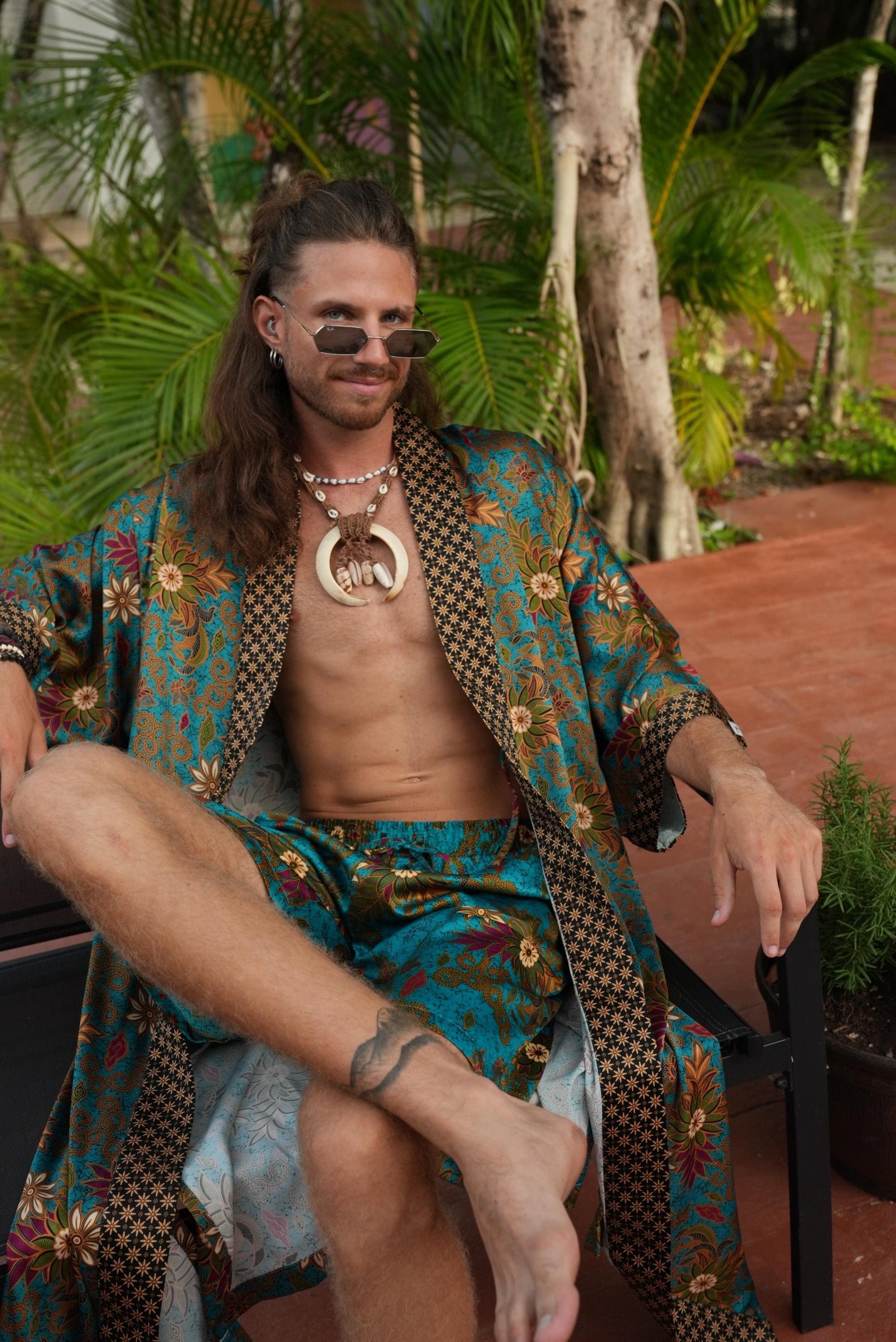 Elevate your downtime with this Authentic Luxury Boho Silk Kimono Set for Men, handcrafted from a silky-soft blend and adorned with traditional Bali batik patterns. This two-piece set includes a flowing kimono-style robe and matching relaxed-fit boxers — the perfect combination of comfort, elegance, and masculine flair.
