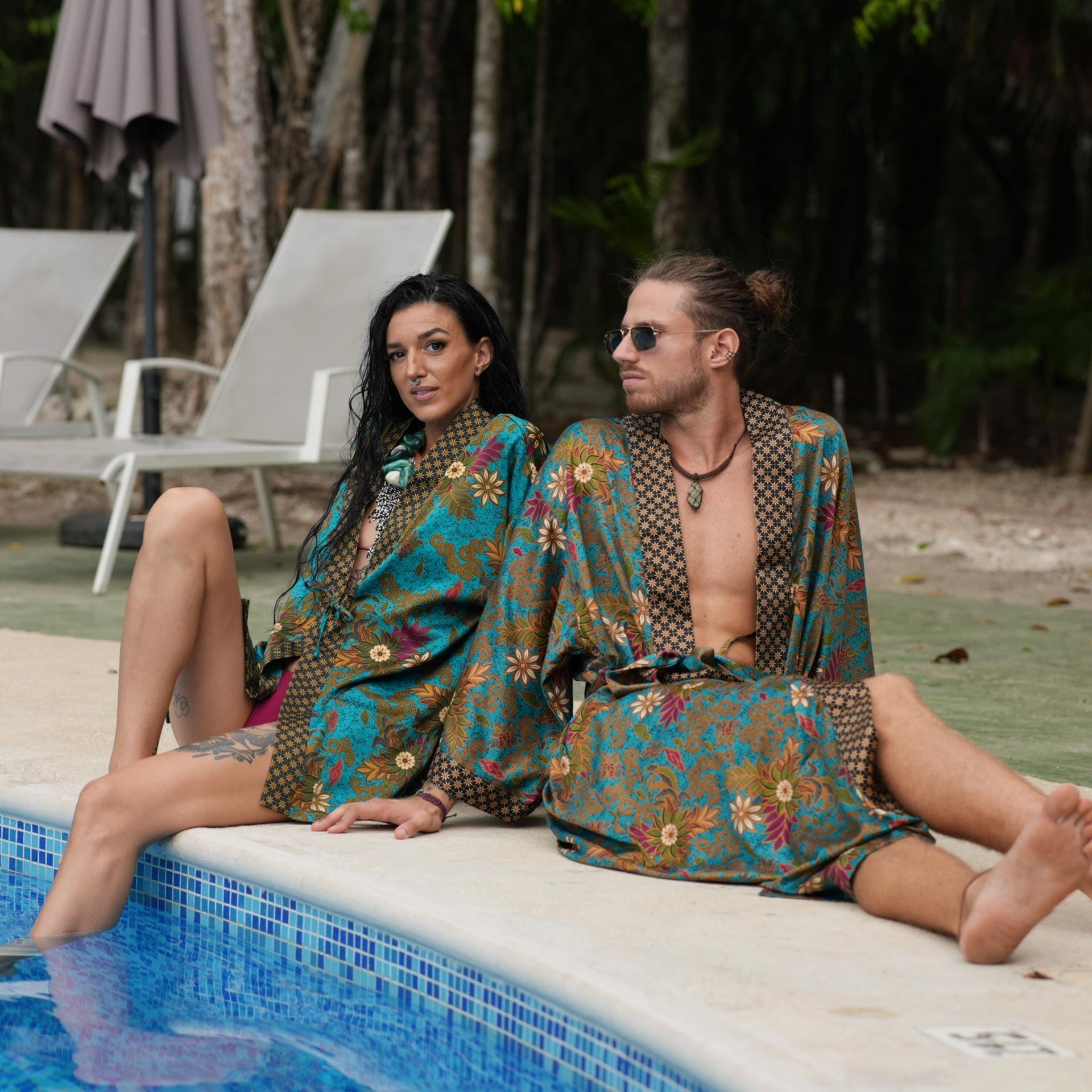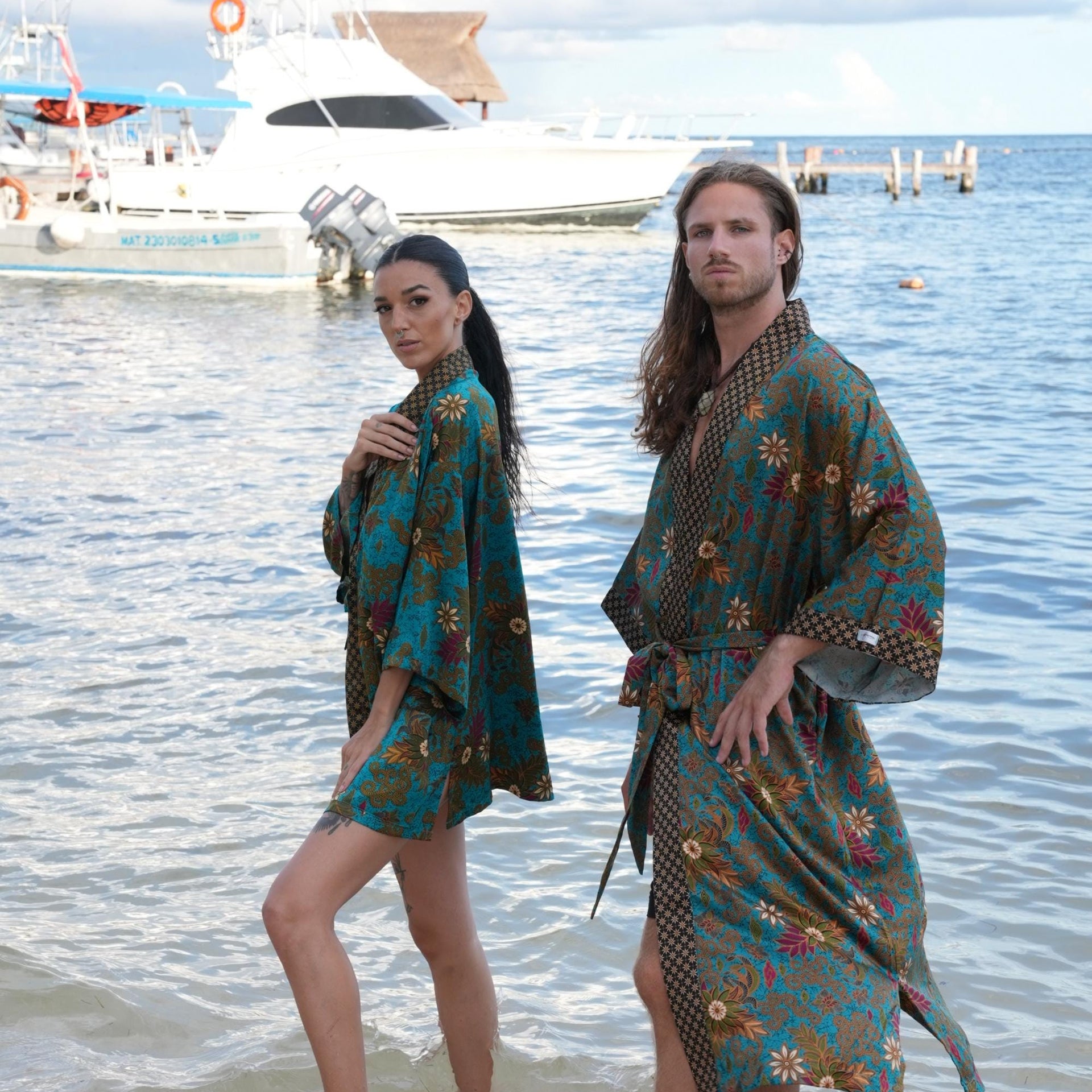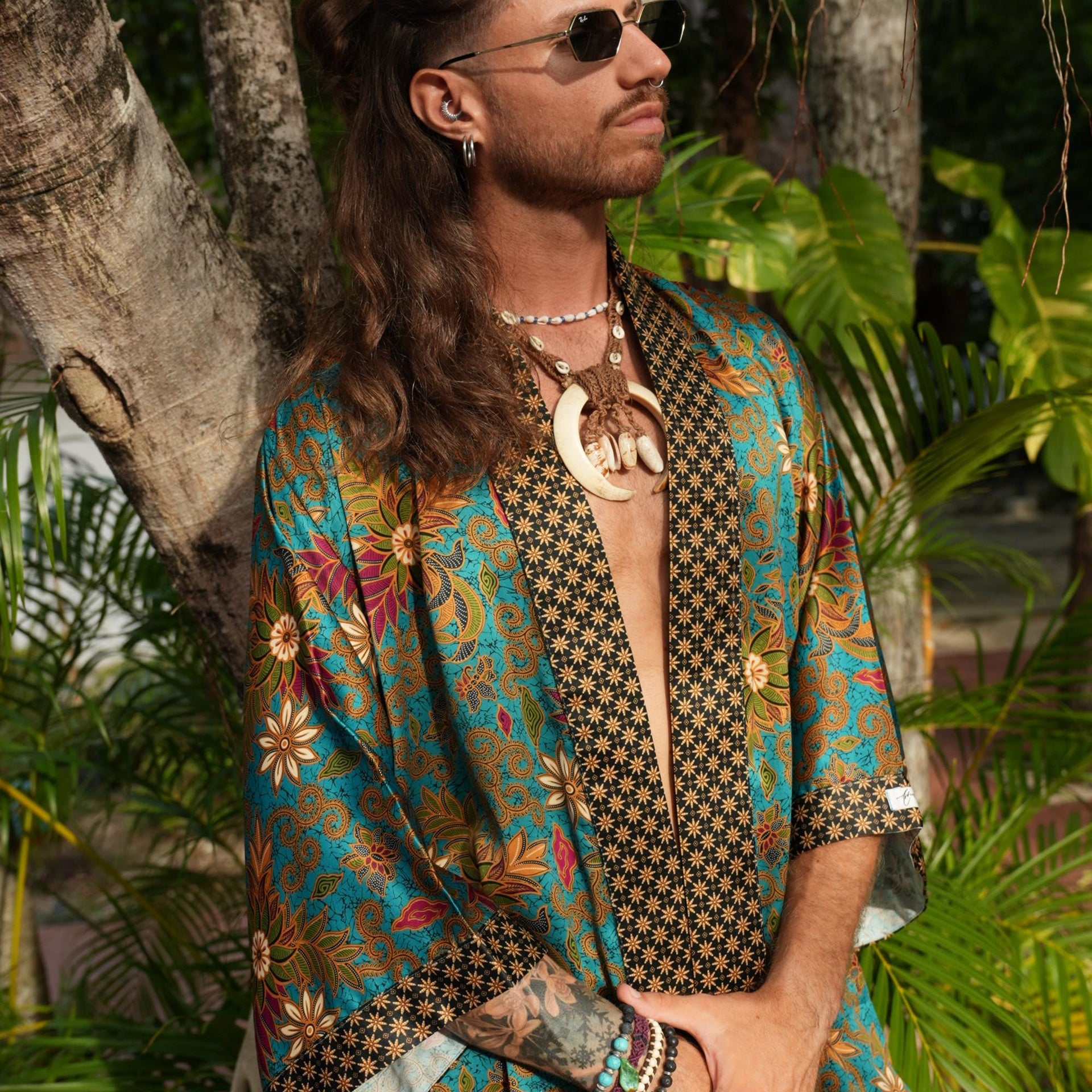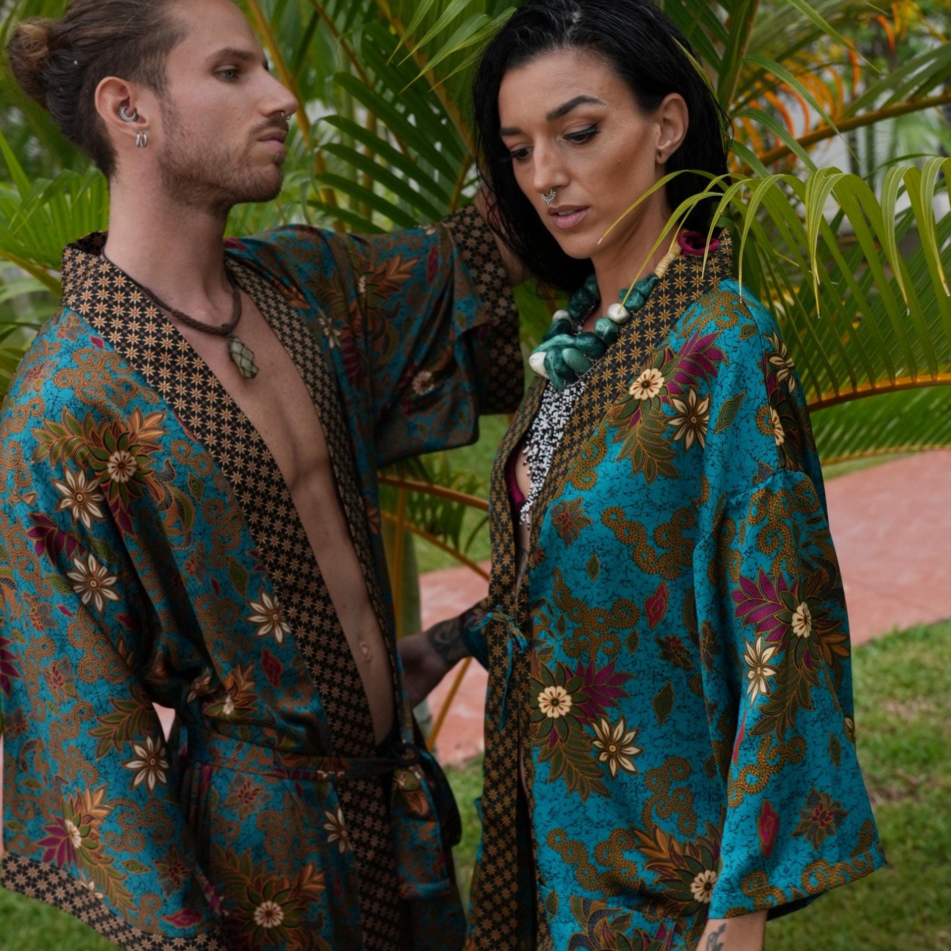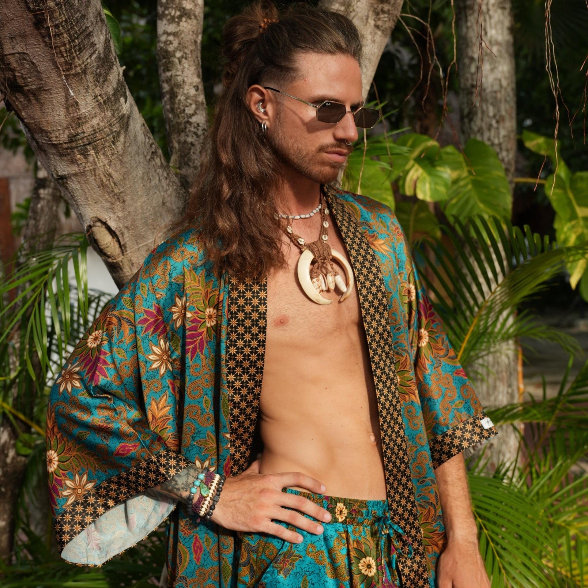 Elevate your downtime with this Authentic Luxury Boho Silk Kimono Set for Men, handcrafted from a silky-soft blend and adorned with traditional Bali batik patterns. This two-piece set includes a flowing kimono-style robe and matching relaxed-fit boxers — the perfect combination of comfort, elegance, and masculine flair.