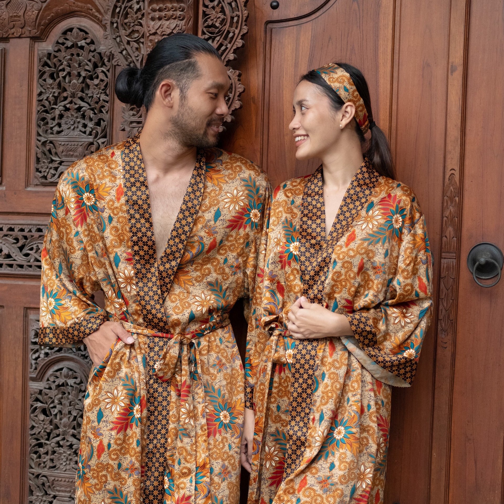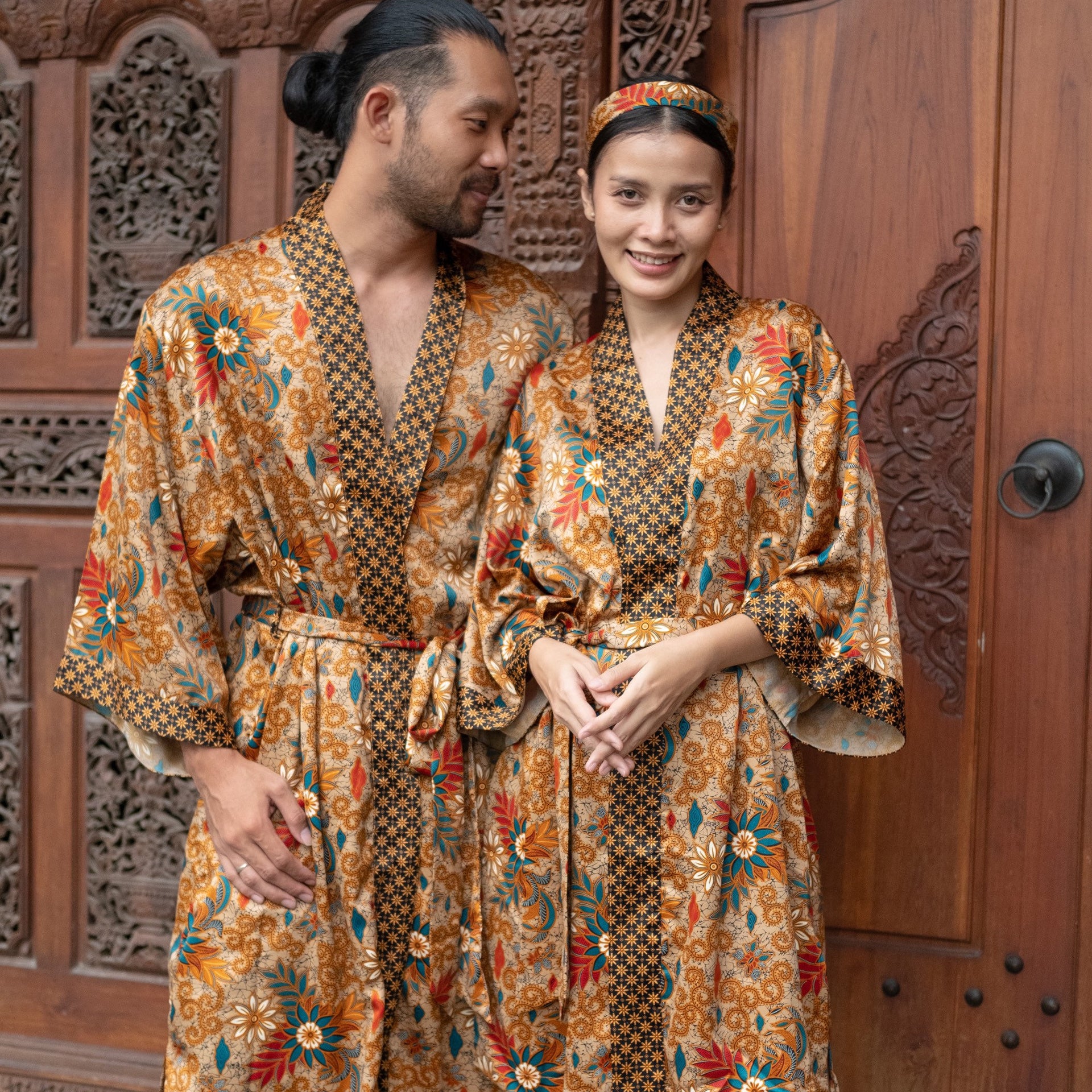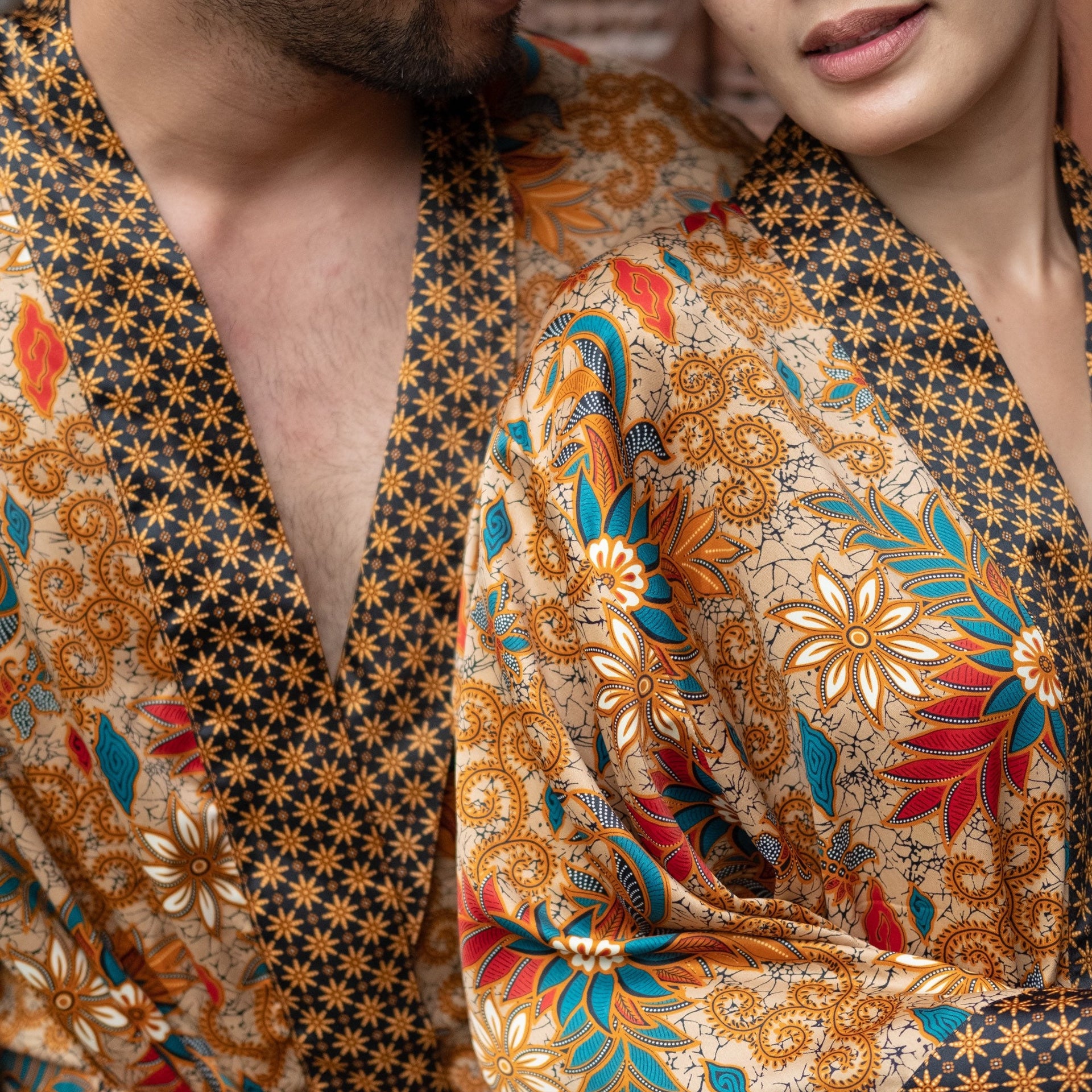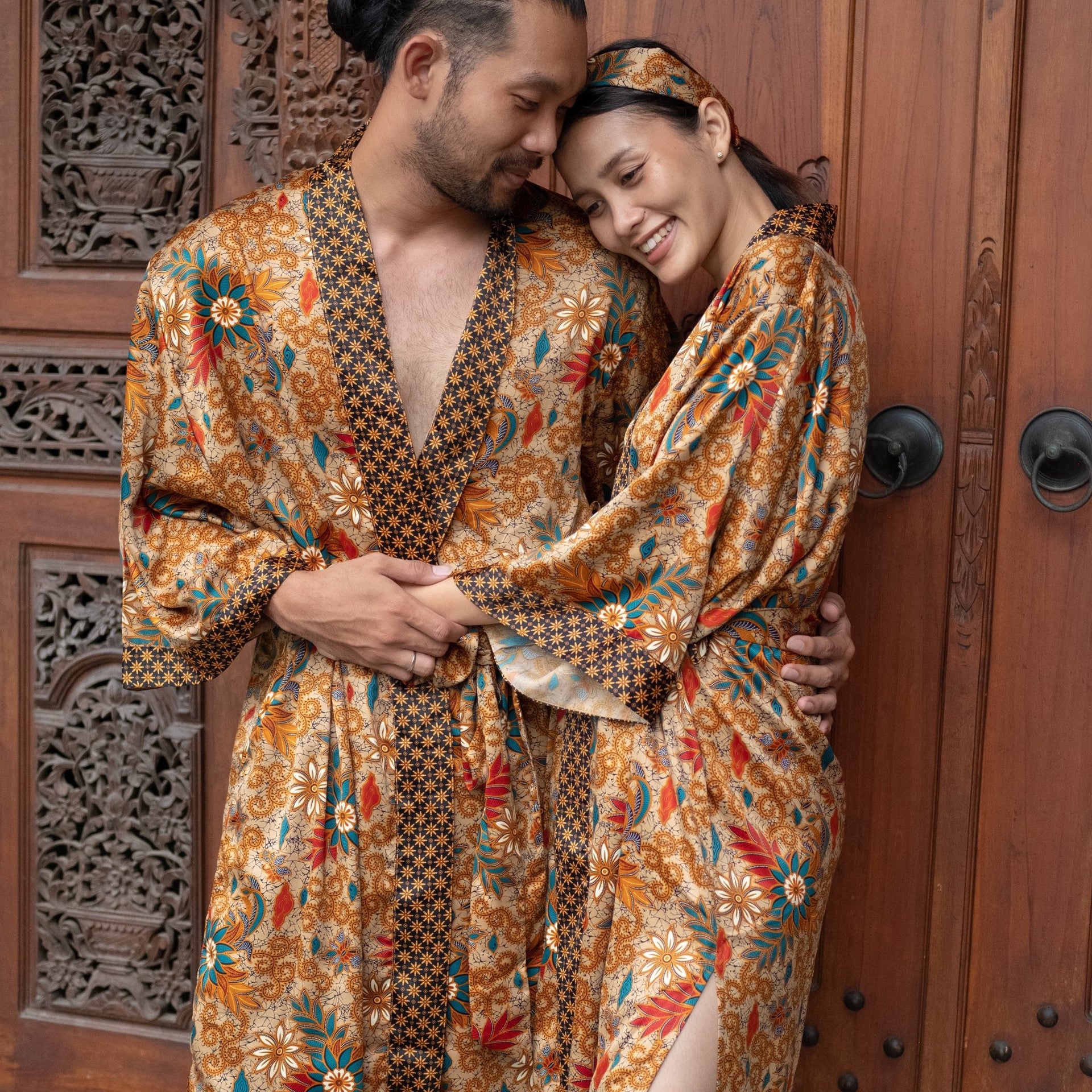 The gift Silk Satin blend Atlas Boho Bali Batik Kimono silk robe kimono adds some romance to your life with one of our Boho robes. You can choose matching patterns for you and your partner to wear as you lounge in luxury together.