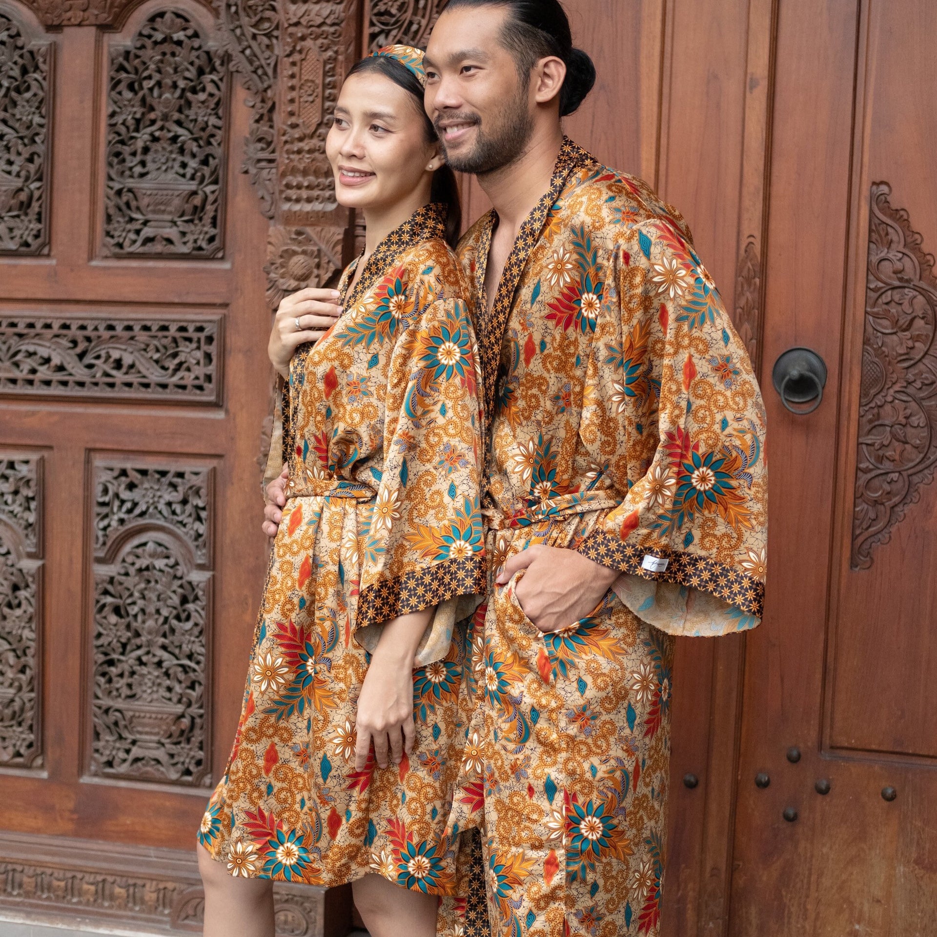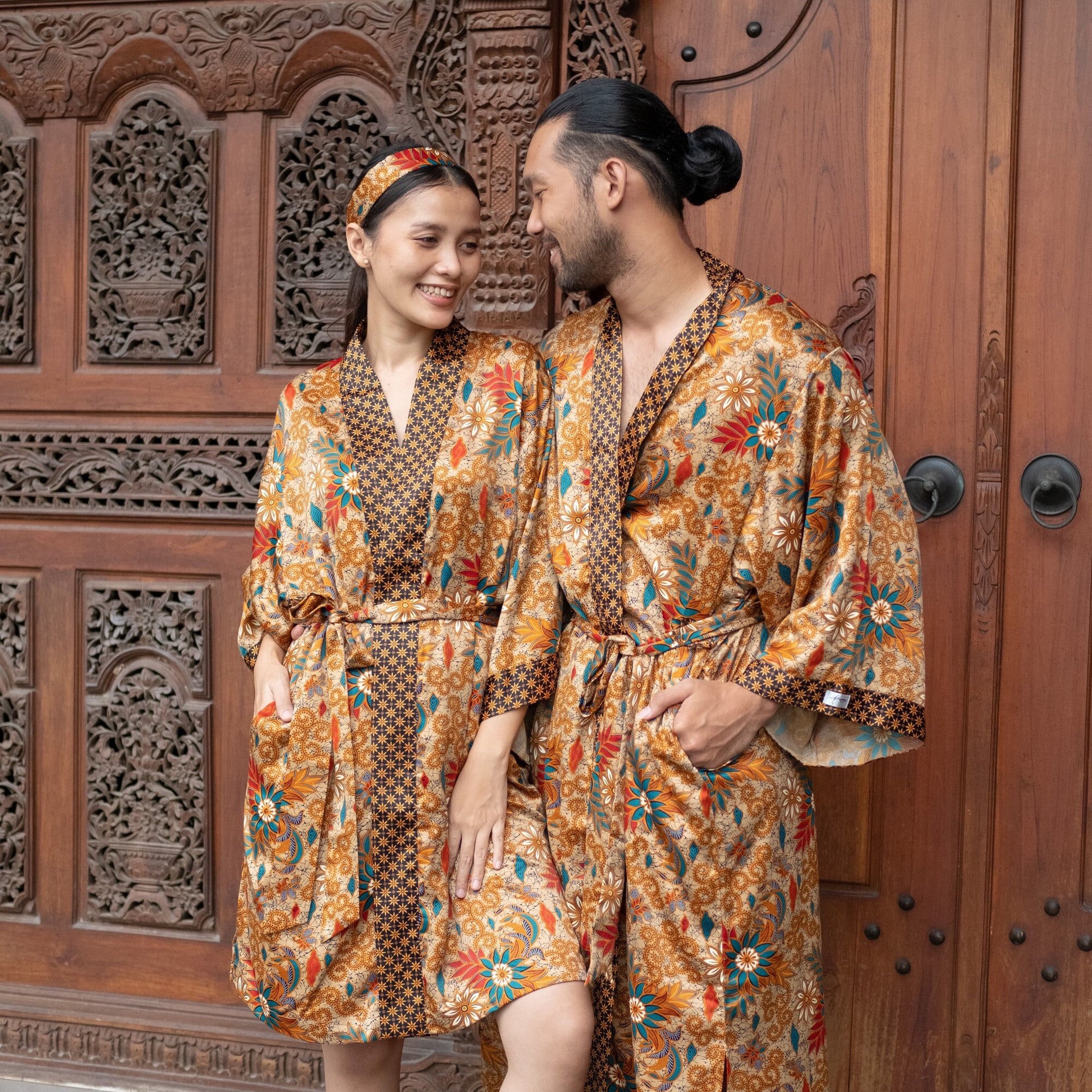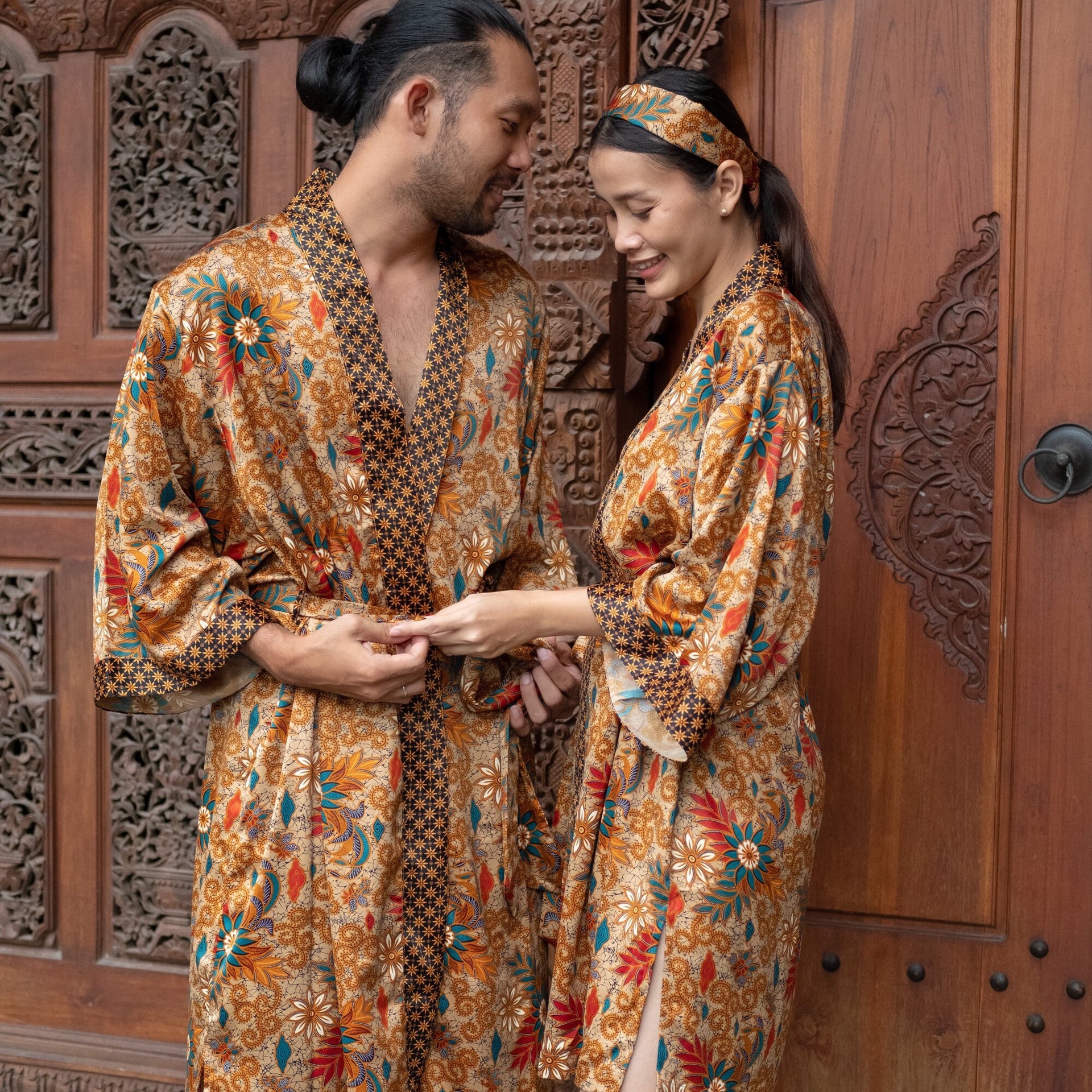 The gift Silk Satin blend Atlas Boho Bali Batik Kimono silk robe kimono adds some romance to your life with one of our Boho robes. You can choose matching patterns for you and your partner to wear as you lounge in luxury together.