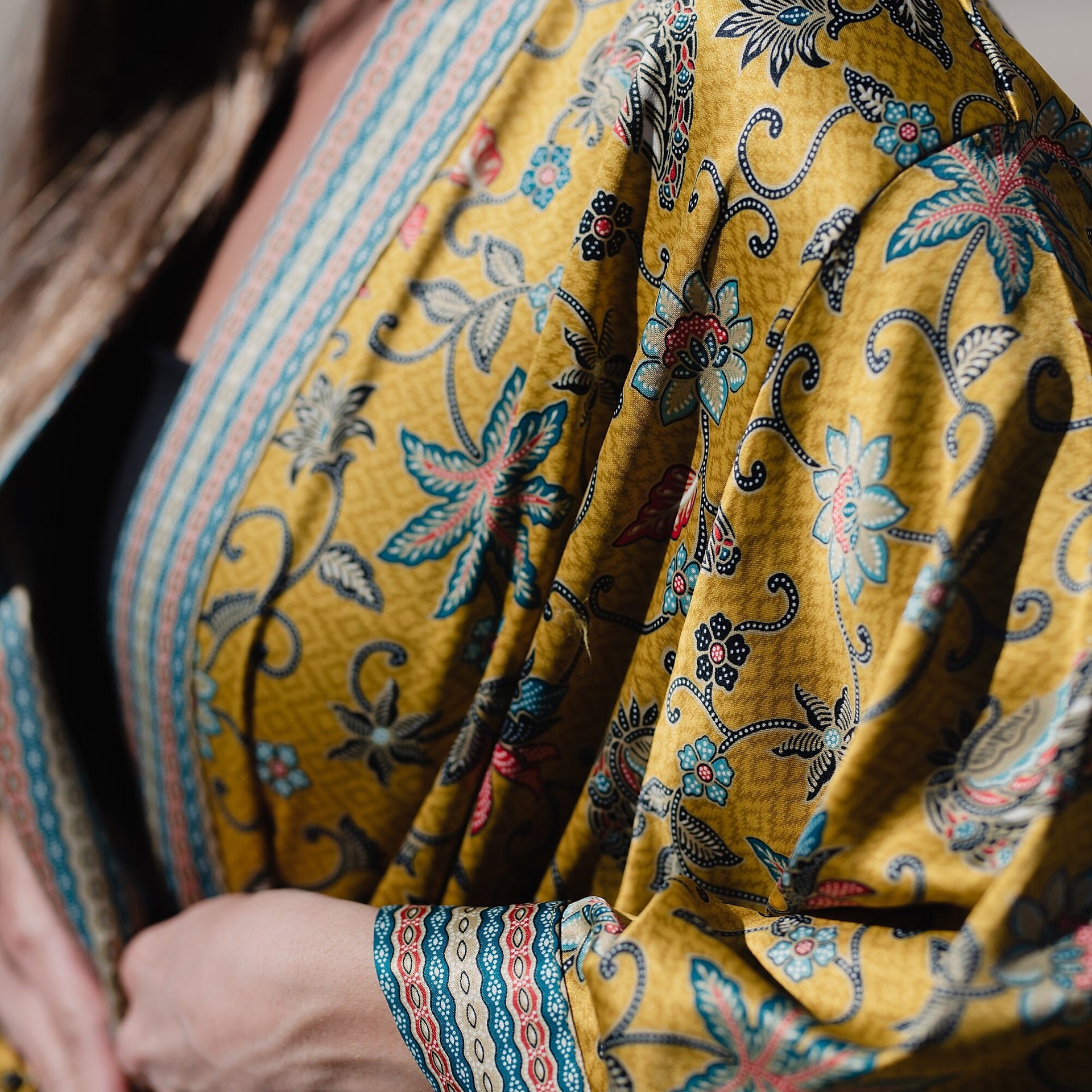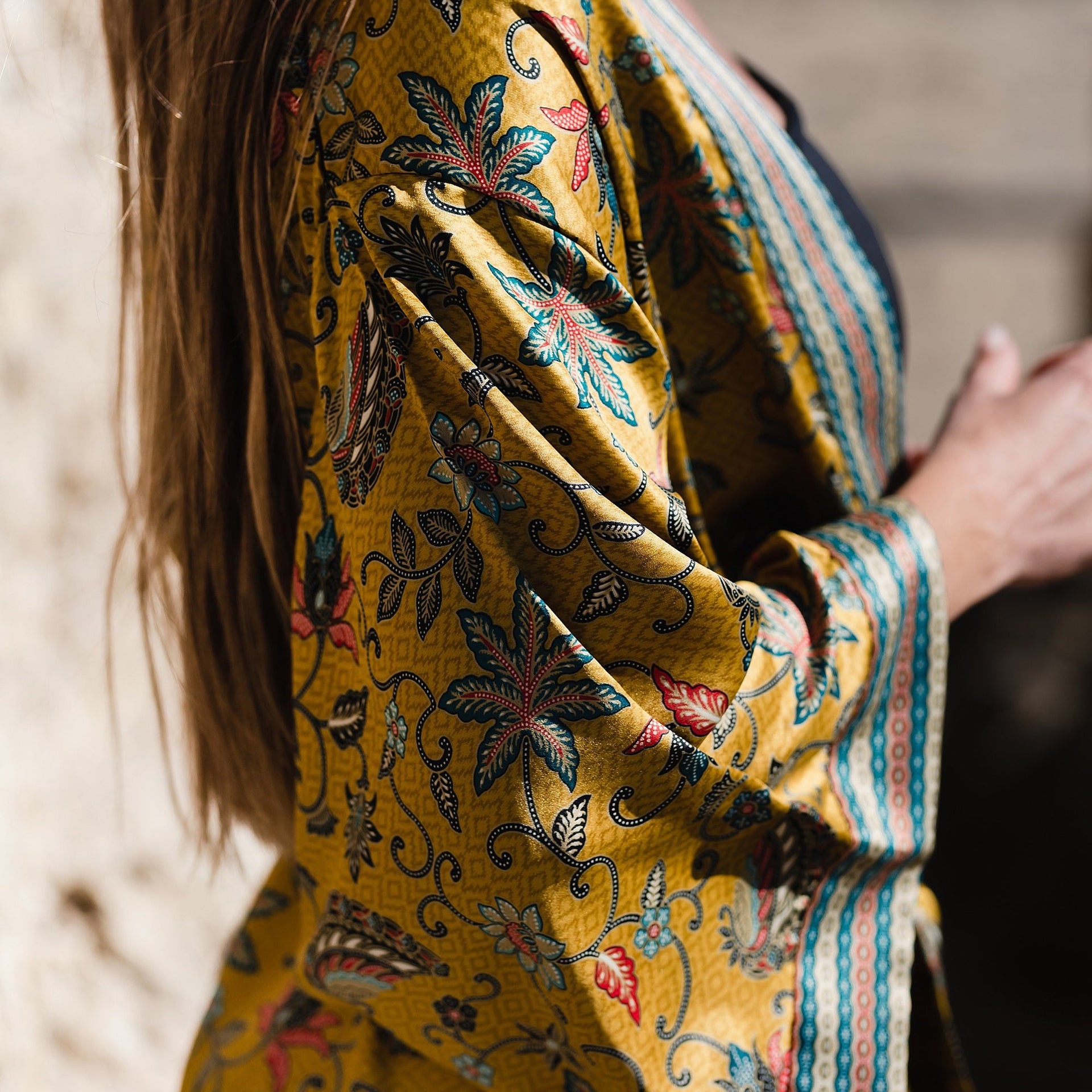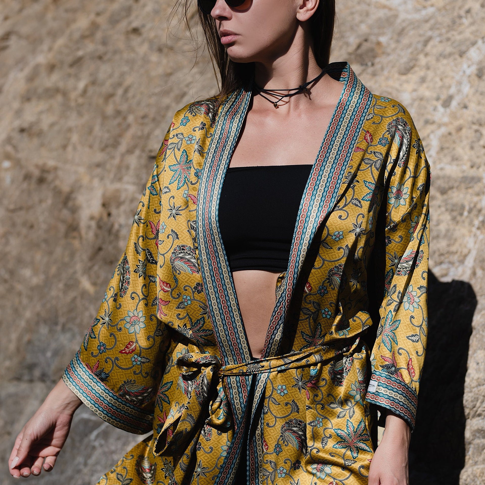 Short Atlas Silk Blend caftan kimono robe for Bridesmaids, Pride Parade, Women Robe Long, High-quality Bali Java Batik floral vacation robe. This beautiful Atlas Silk Blend caftan kimono robe is perfect for bridesmaids, pride parades, and other special occasions. It is made from high-quality Bali Java